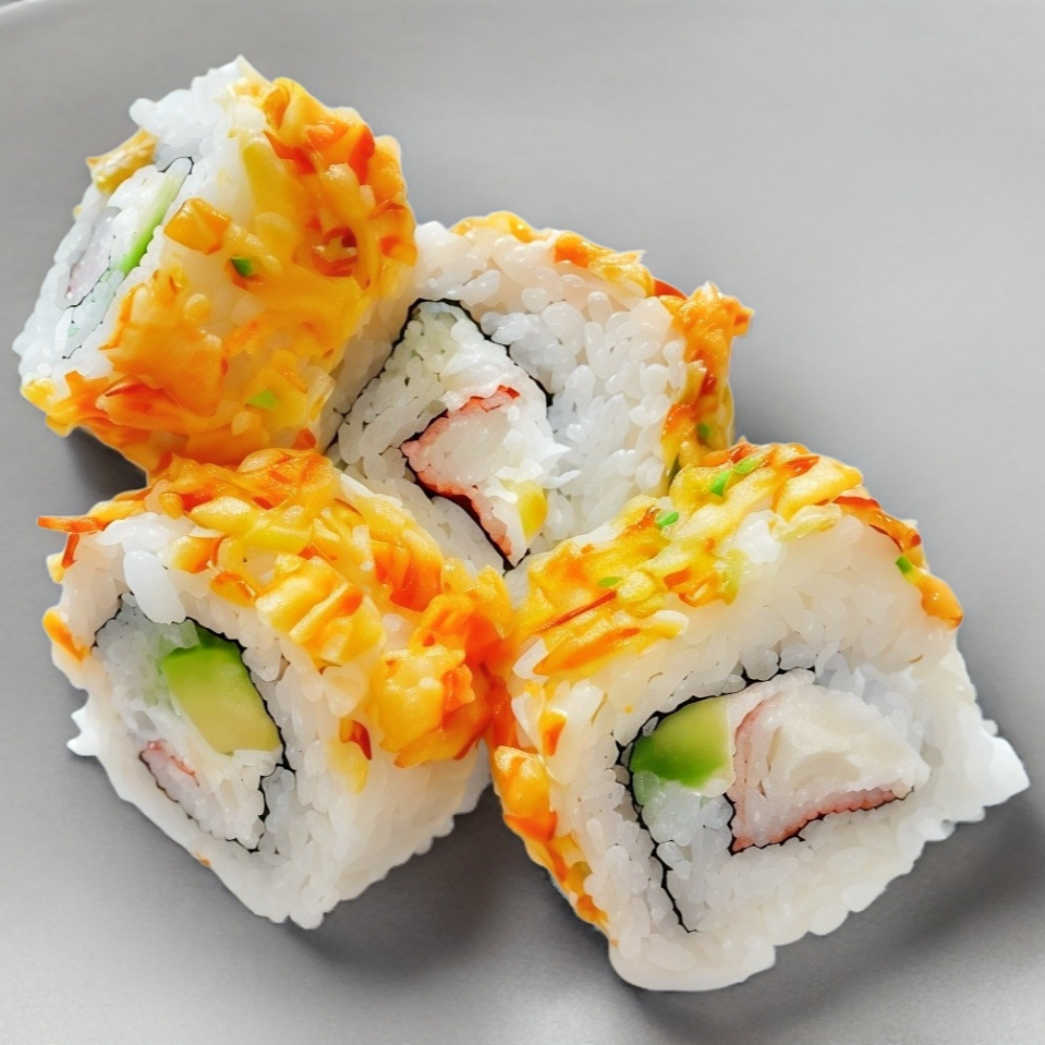 Por dentro salmón, queso crema y pepino, por fuera aguacate, topping grangrejo spicy.