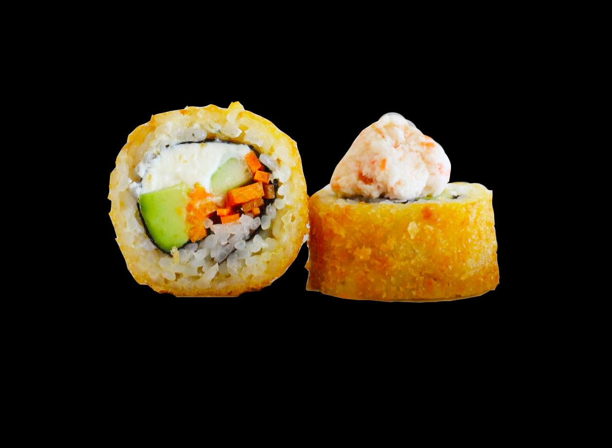 Por dentro pepino, aguacate, zanahoria, filadelfia, por fuera empanizado con tampico.