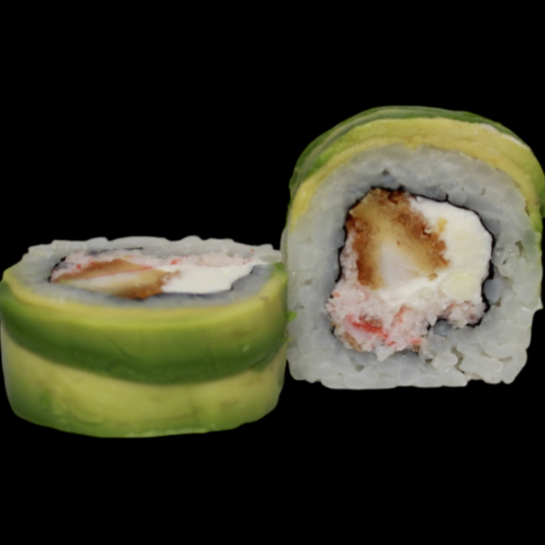 Aguacate, Philadelphia, envuelto en pepino, por fuera aderezo de masago, con camarón empanizado bañado en salsa de anguila y ajonjolí.