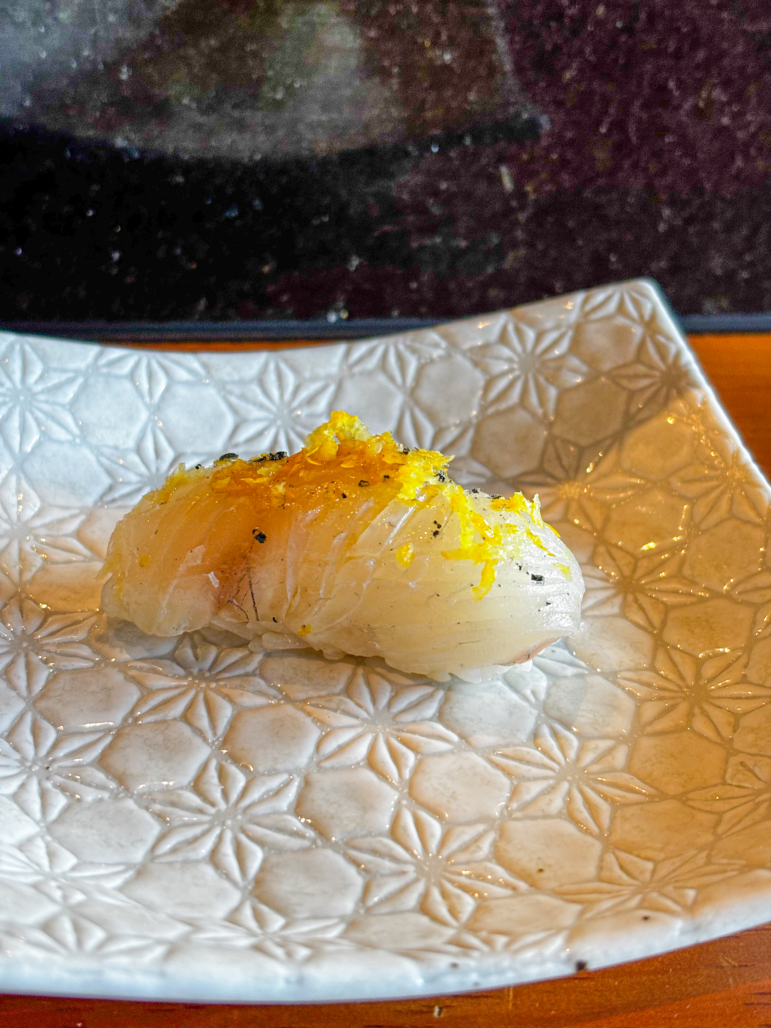 Arroz, hamachi picado con cebollín, preparación cítrica.