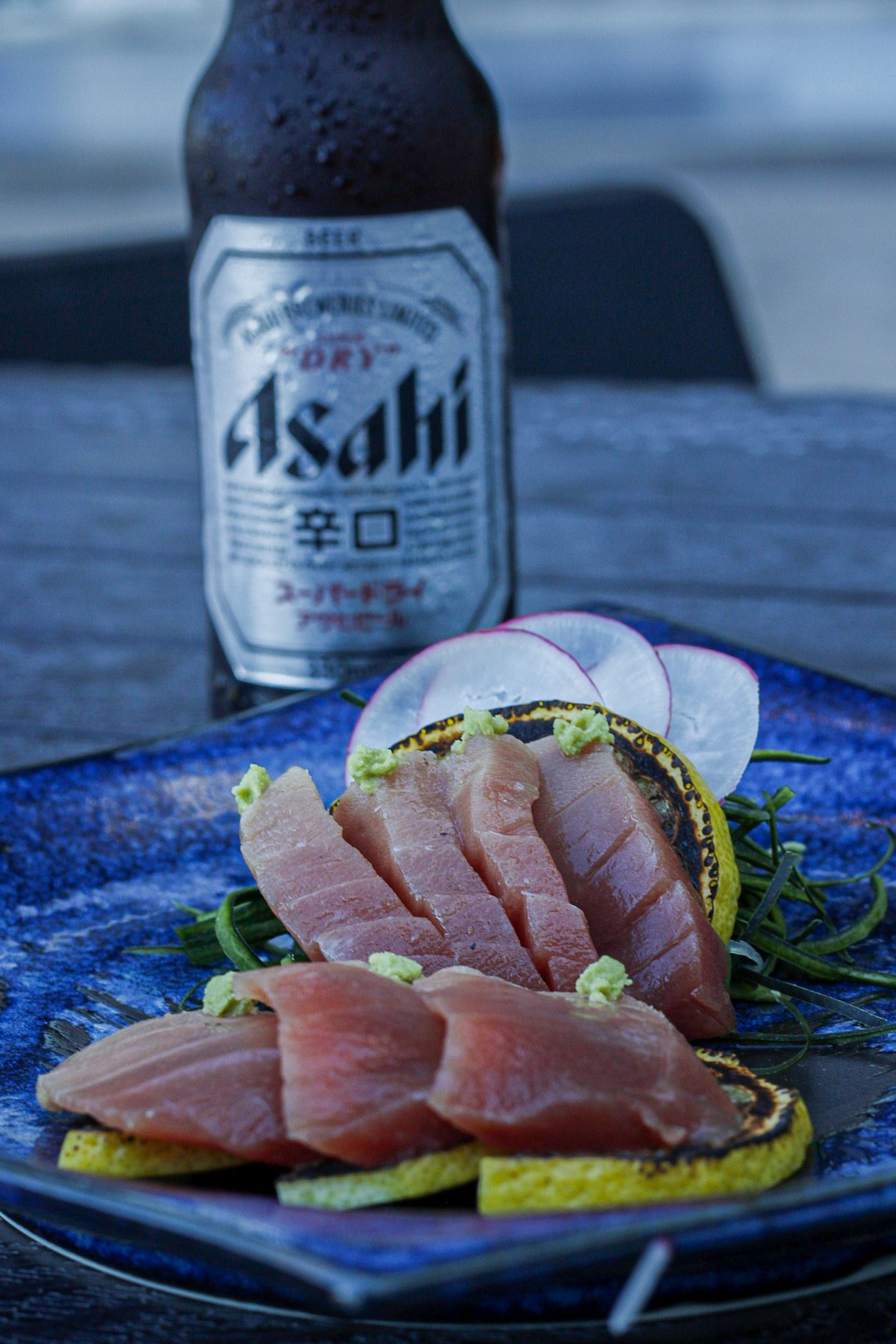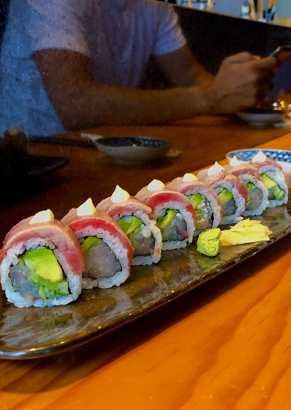 Relleno de pepino, aguacate y pescado blanco cítrico. Por fuera: atún flameado y wasabi.