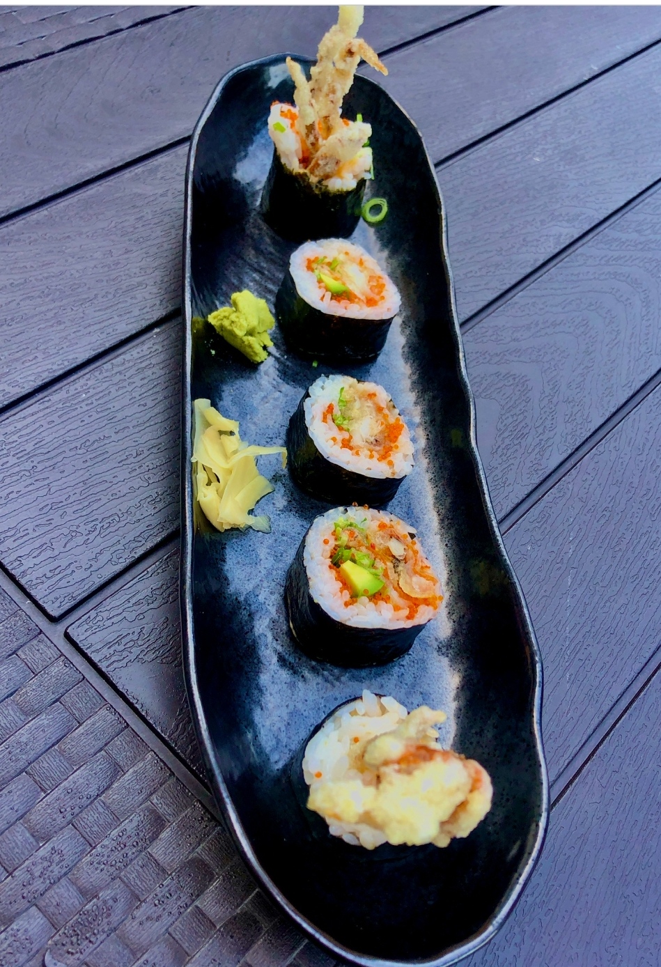 Por dentro: aguacate, pepino y camarón. Por fuera: masago, ajonjolí y aderezo spicy.