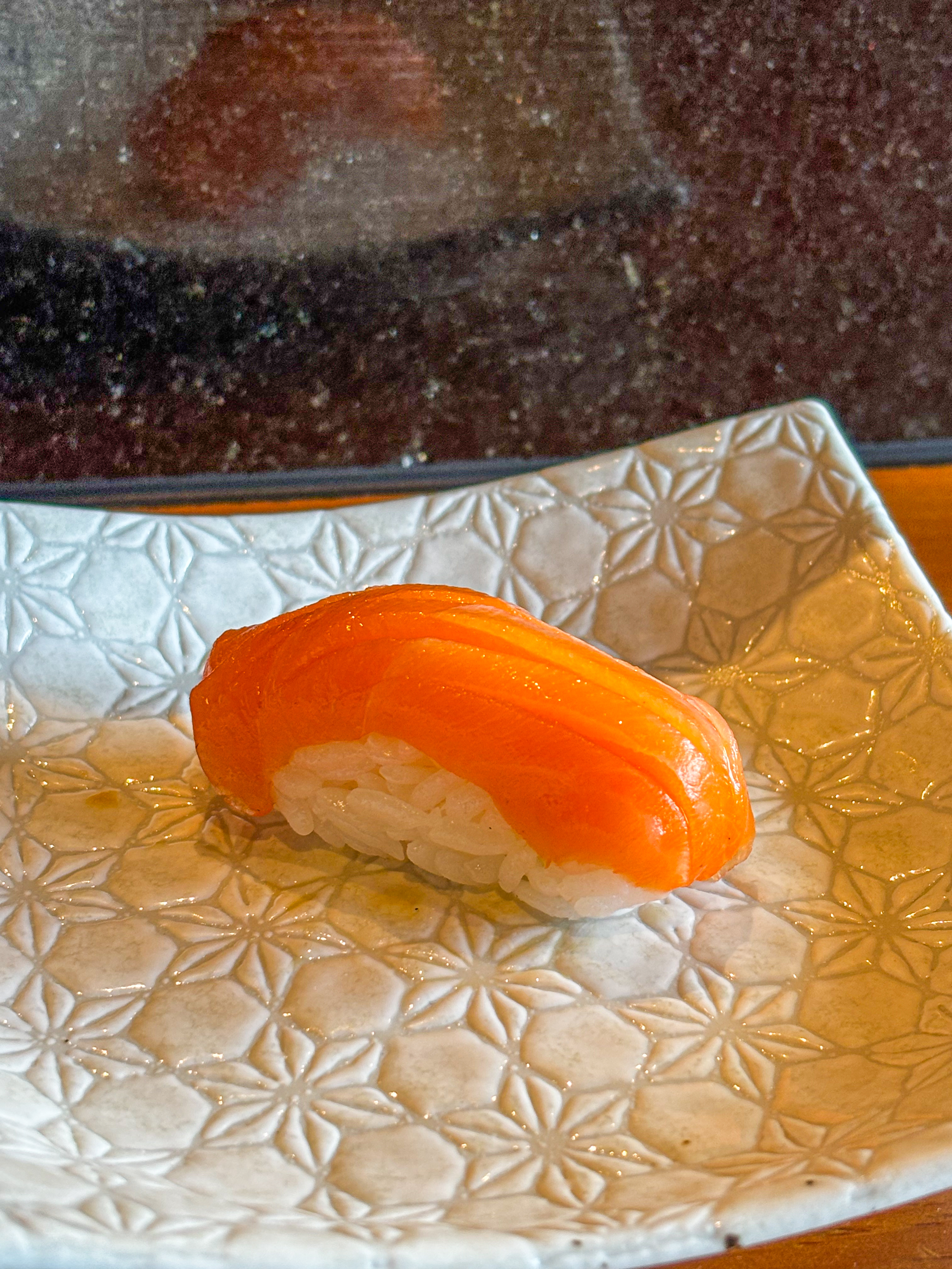 Relleno de espárrago, aguacate y anguila. Por fuera: salmón flameado.