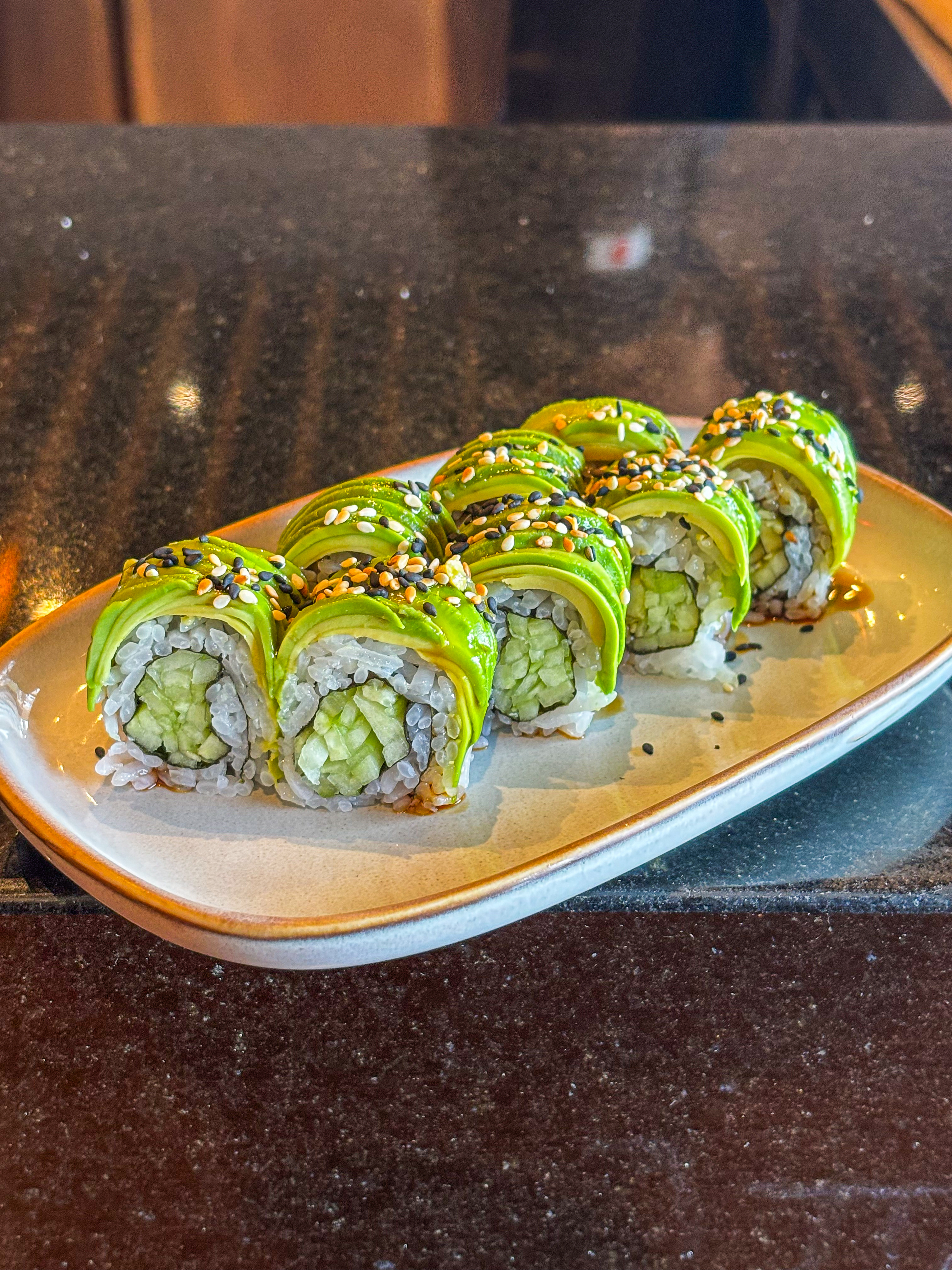 Por dentro: aguacate, pepino y kanikama. Por fuera: masago, ajonjolí y aderezo spicy.