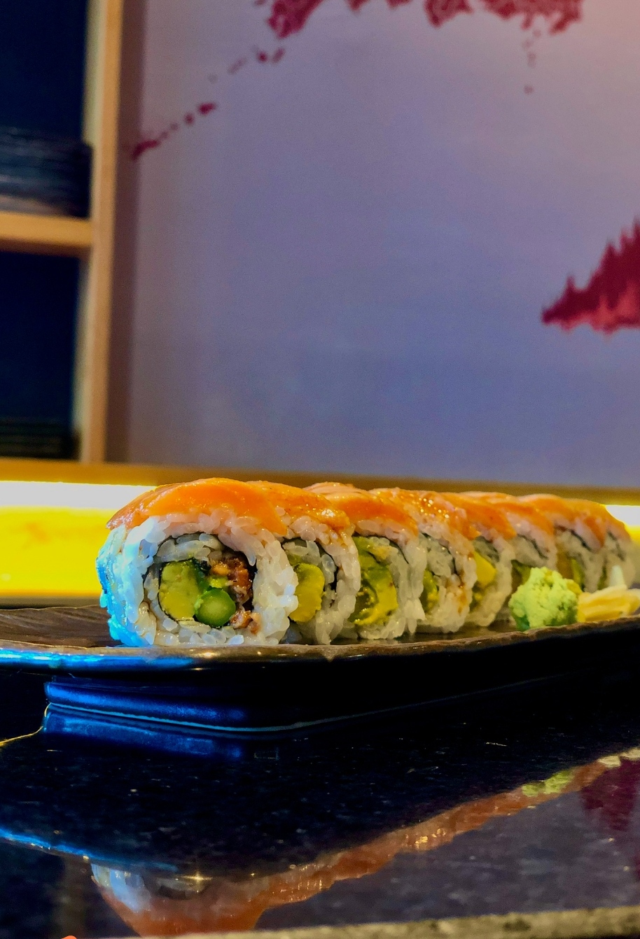 Por dentro: aguacate, pepino y salmón. Por fuera: masago, ajonjolí y aderezo spicy.