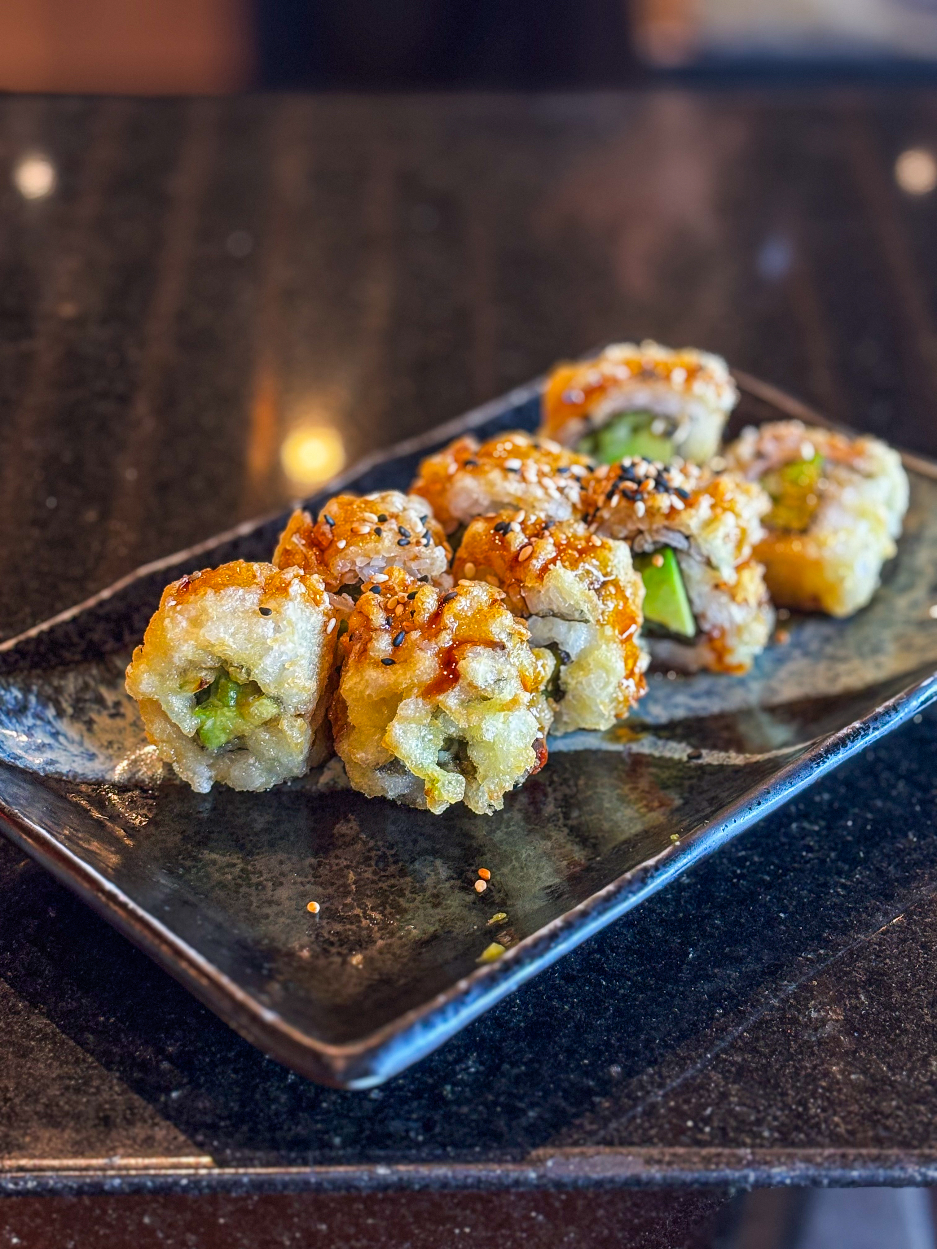 Masago, aguacate, cebollín, aderezo spicy y soft shell frita.