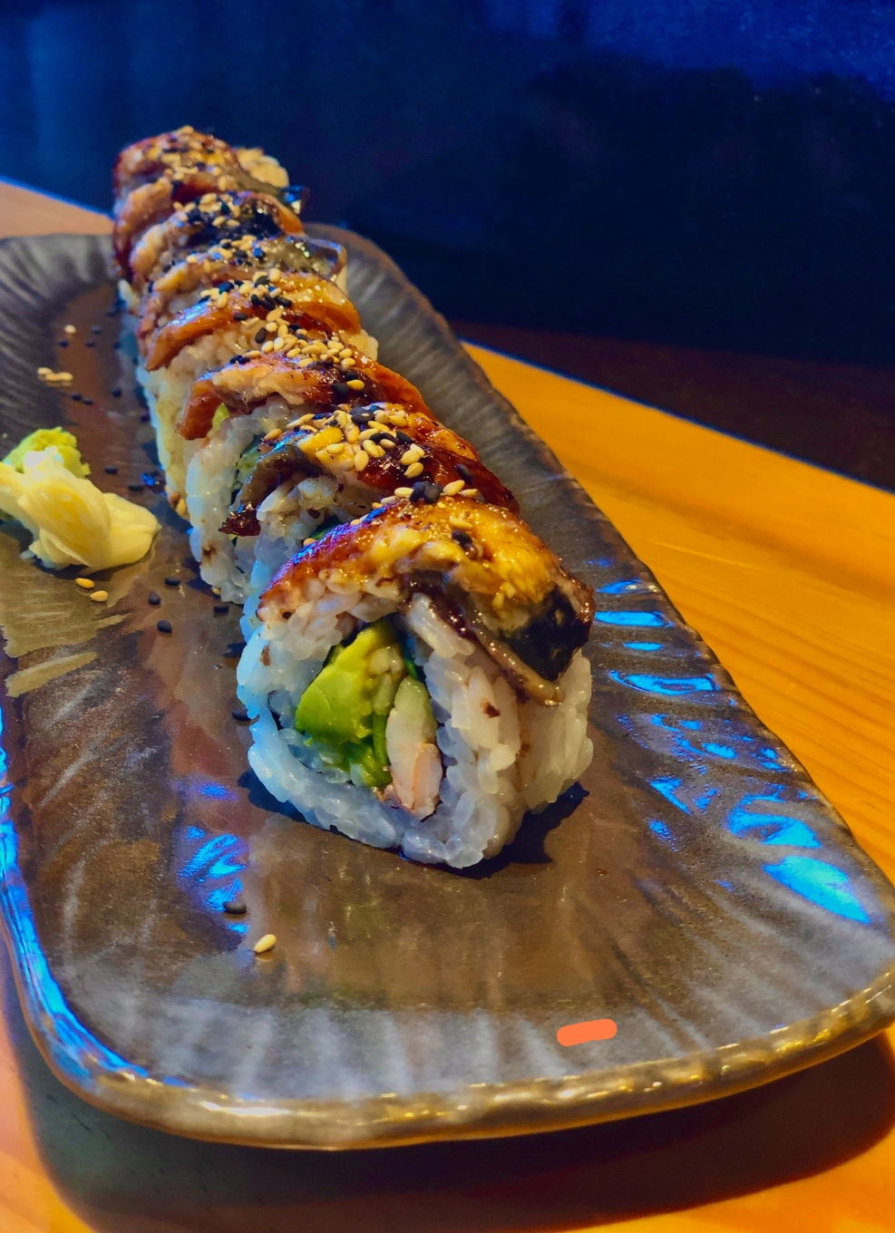 Por dentro: aguacate, pepino y akami. Por fuera: salsa de anguila y ajonjolí.