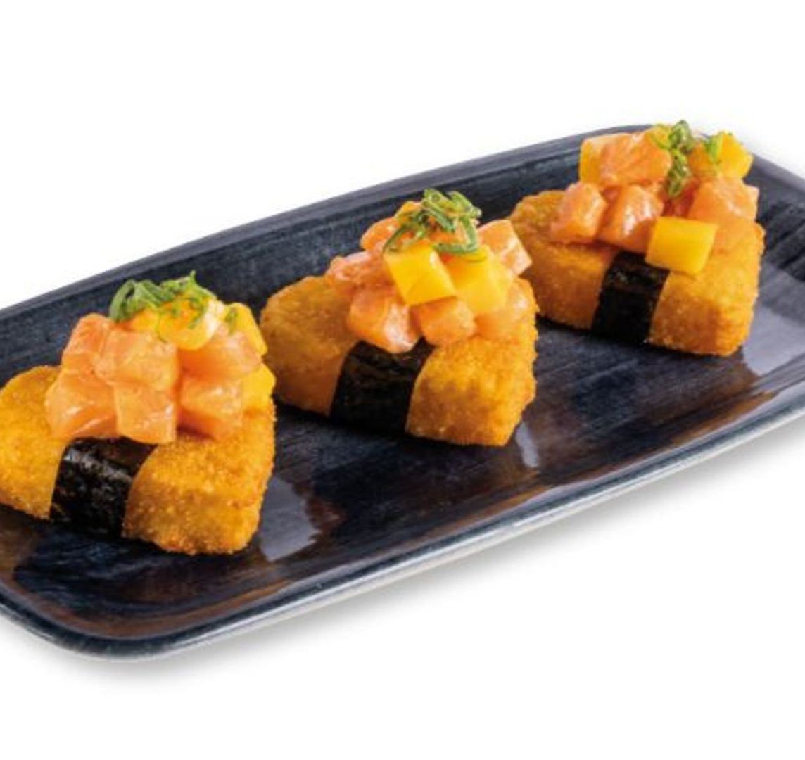Croquetas empanizadas de papa, queso, camarón y chiles toreados con nori, salmón, mango, aderezo chipotle y salsa Sriracha, cebollín.