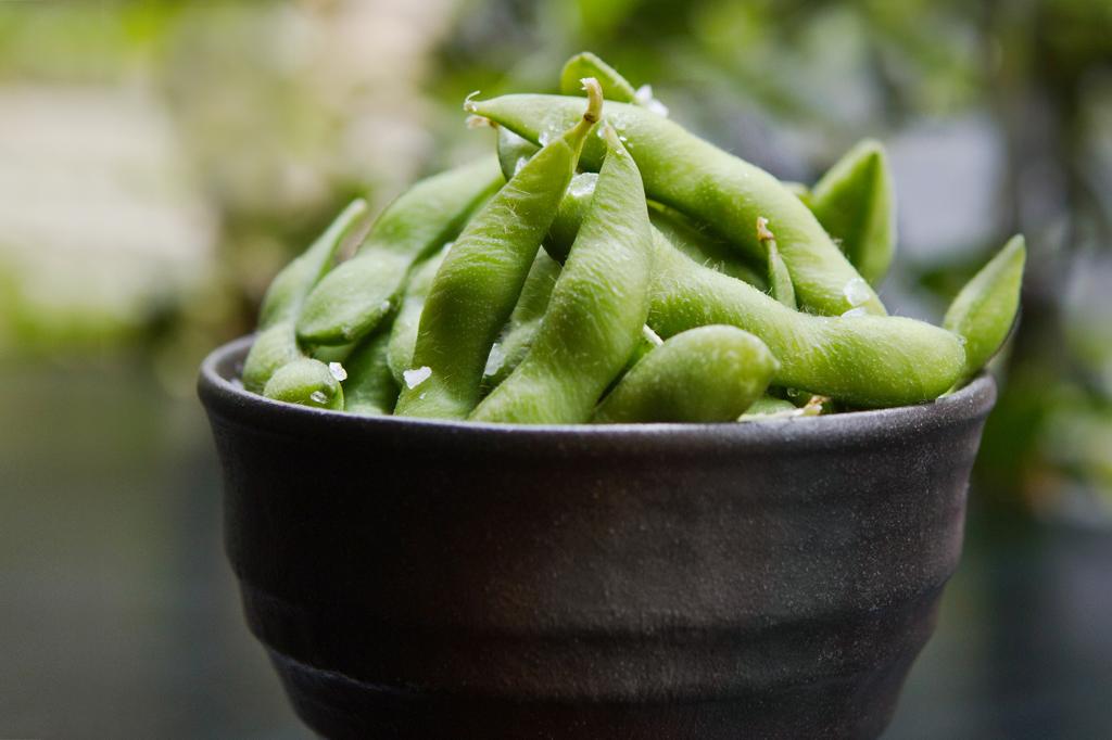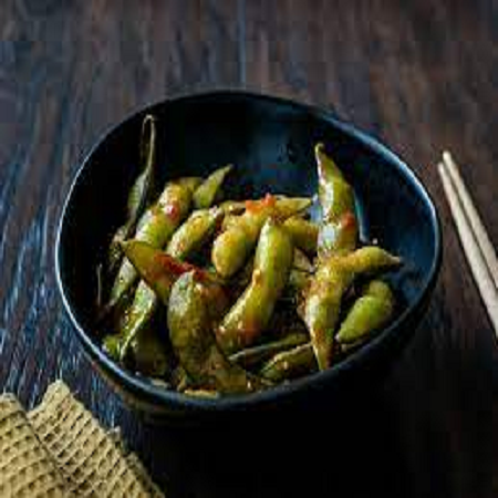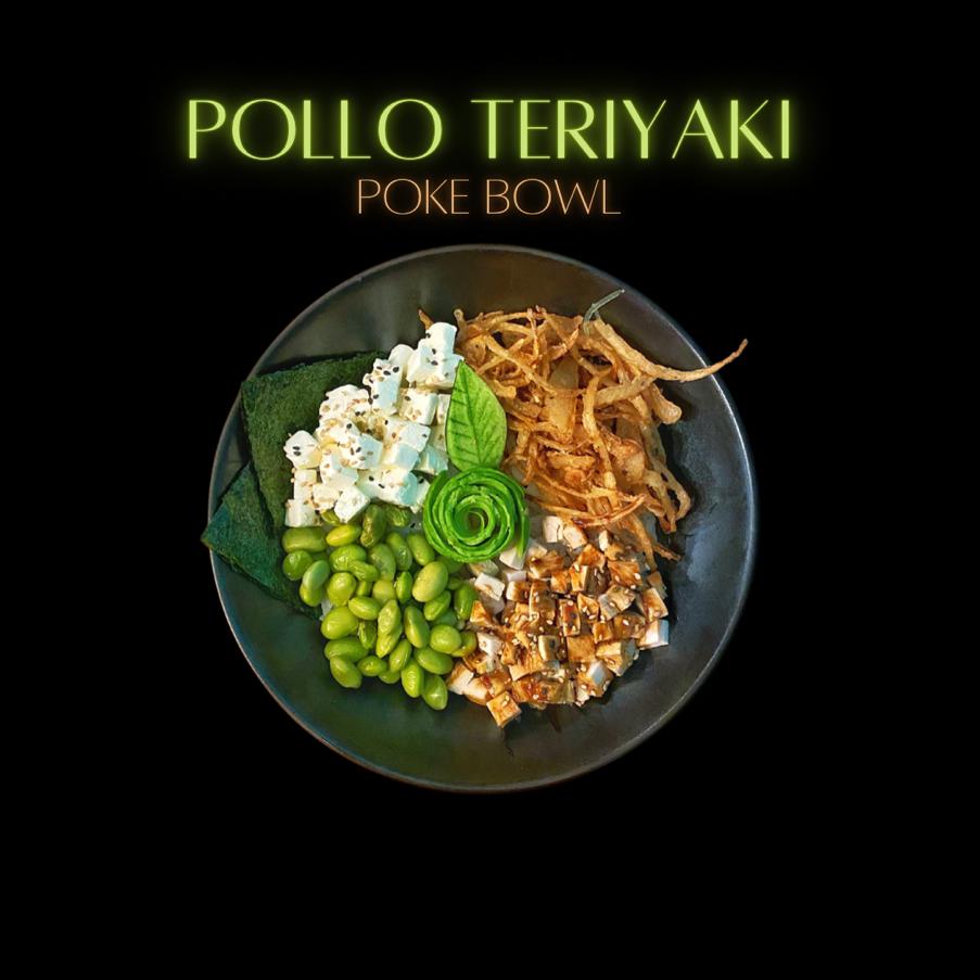 Pollo a la plancha con salsa terivaki, aguacate, alga nori, crujiente de cebolla, queso philadelphia y edamames sobre cama de arroz.
