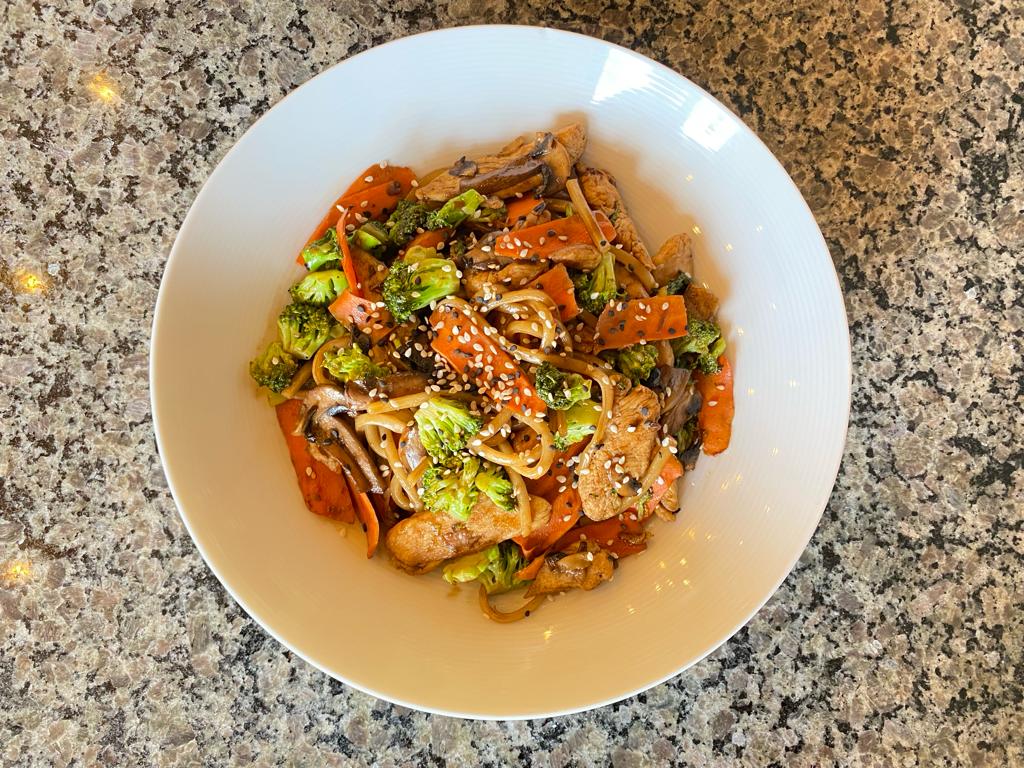 Pasta Udon con pollo, zanahoria, champiñón, bañada en salsa teriyaki hecha en casa.