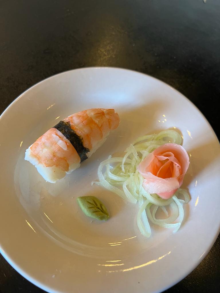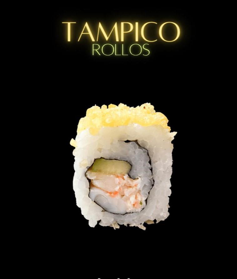 Relleno de camarón, tampico, pepino, cubierto con chispas tempura y salsa de anguila.