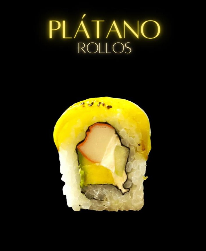 Relleno de surimi, pepino, aguacate, queso crema cubierto de platano frito.