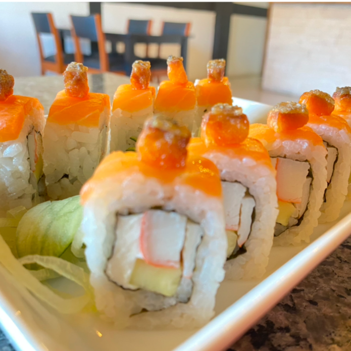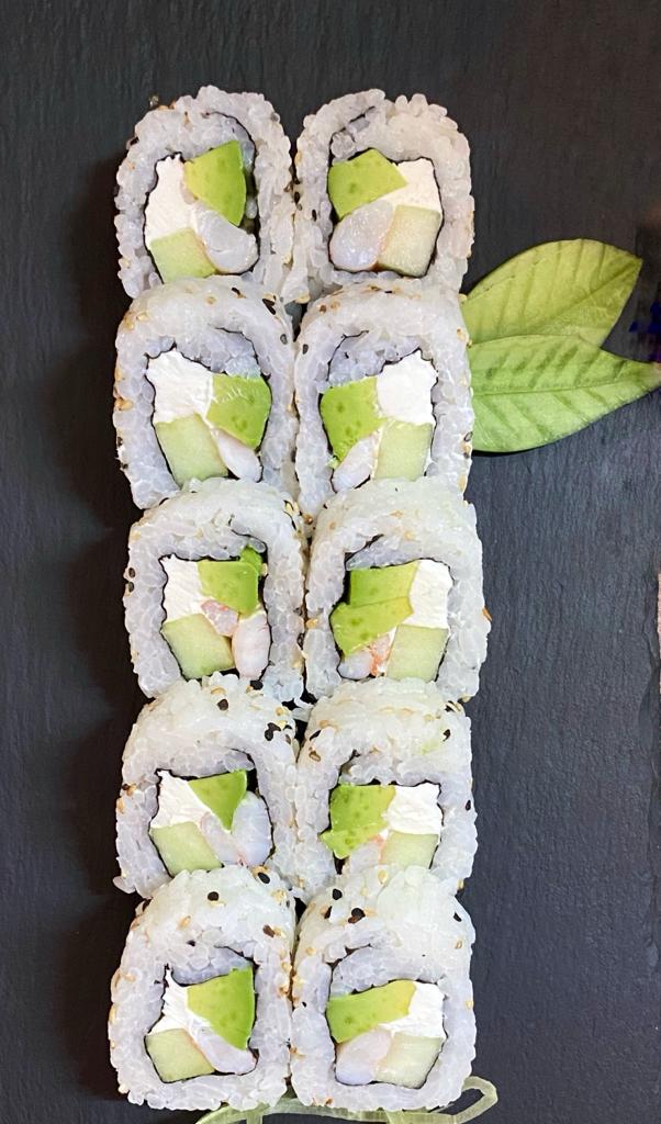 Relleno de camarón o salmón, aguacate, pepino, cubierto con queso crema y ajonjolí.