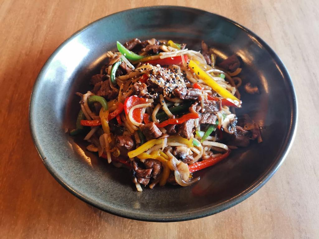 Pasta udon con filete de res, pimiento, cebolla y champiñón, bañado en salsa teriyaki hecha en casa.