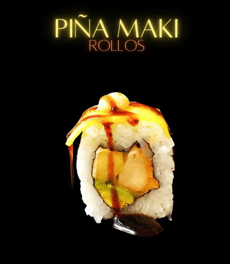Relleno de camarón tempurizado, pepino, aguacate, cubierto de un toque de queso crema y piña asada.