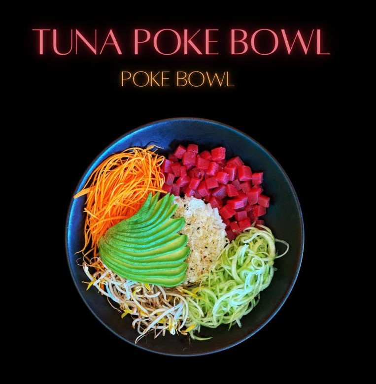 Salmón con un toque de habanero, tomate cherry/uva, aguacate, ensalada de alga, julianas de won ton y pepino sobre cama de arroz.