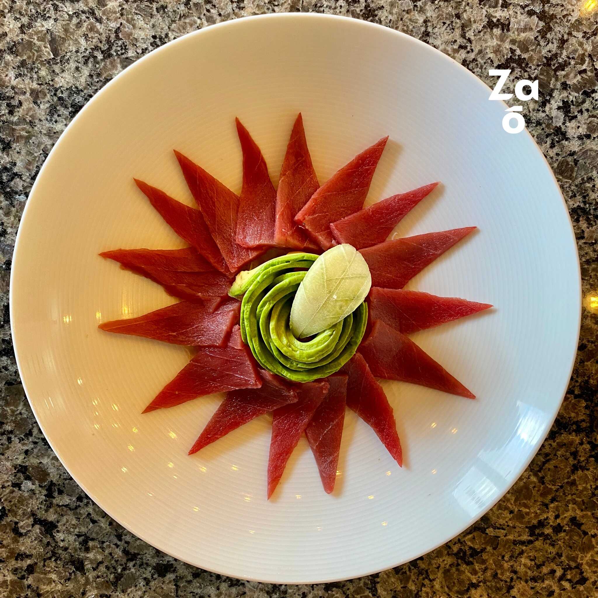 Relleno de atún picante, pepino, aguacate, alga por fuera y topping de atún macha.