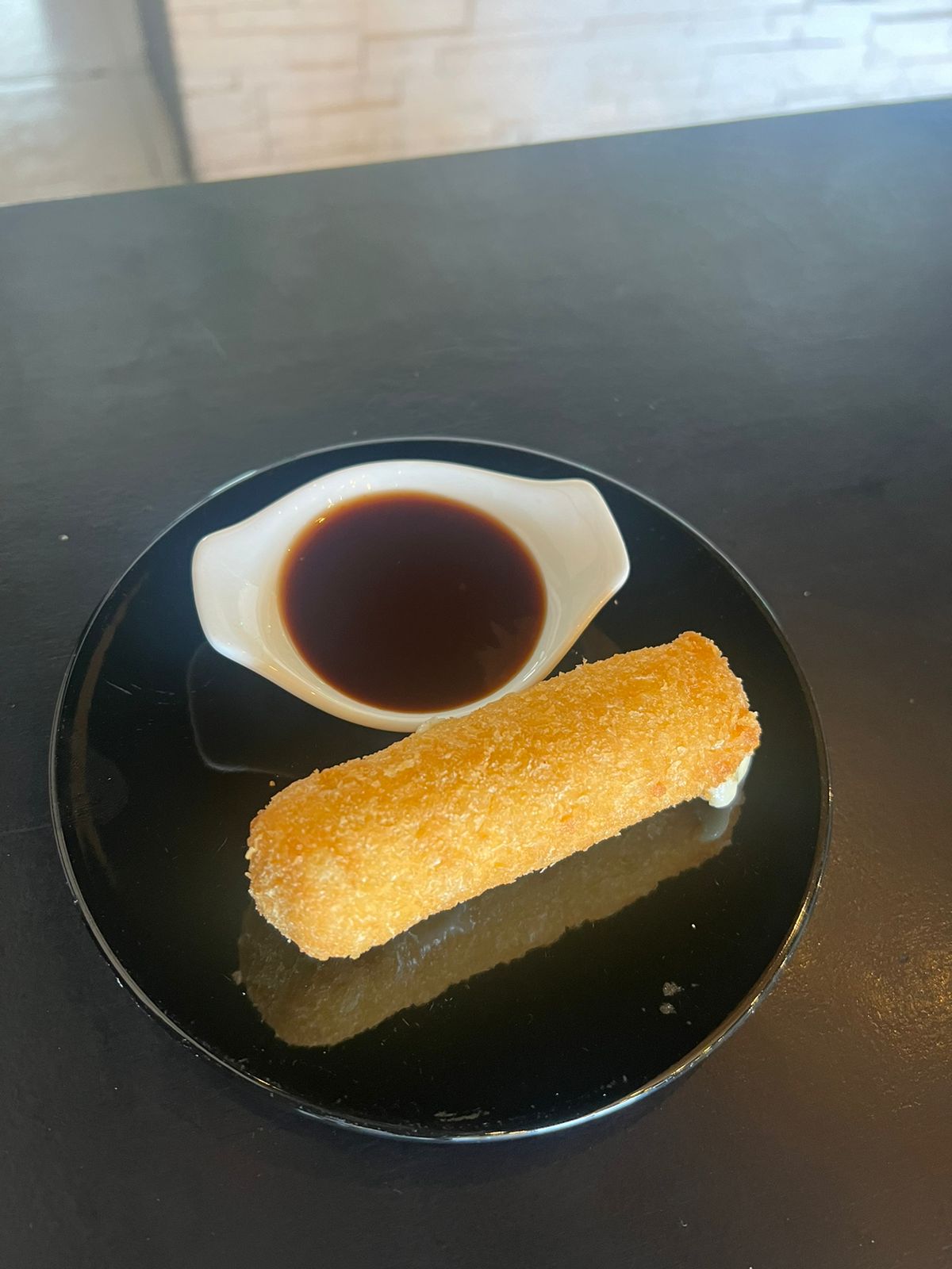 Relleno de res o pollo, queso Philadelphia, chipotle, pepino y aguacate. Cubierto con un toque deajonjolí y despues empanizado.