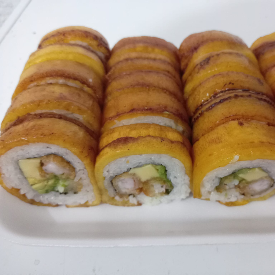 SUSHI ENVUELTO EN PLATANO, LLEVA POR DENTRO CAMARON, PEPINO Y QUESO CREMA.