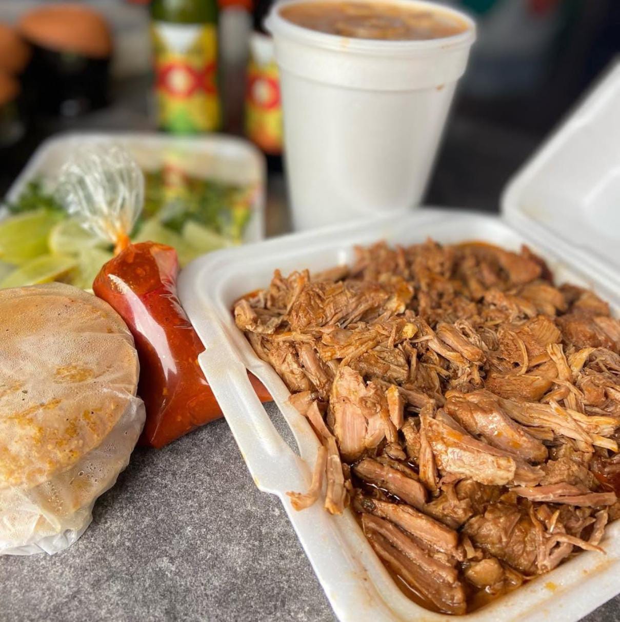1 Kilo de birria pesada, incluye 1 litro de consomé, tortillas, salsa, cebolla, cilantro limones y chiles habaneros.