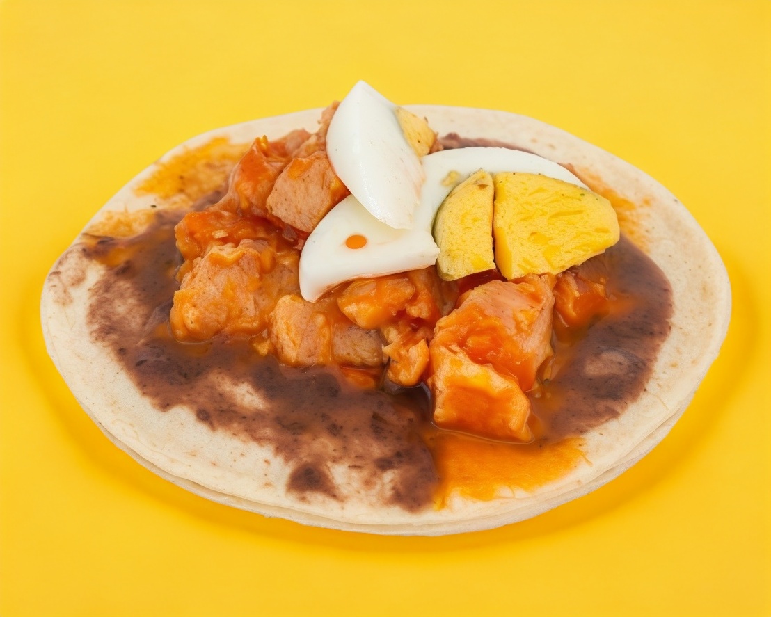 Taco de doble tortilla servido con huevo duro, arroz y frijoles.