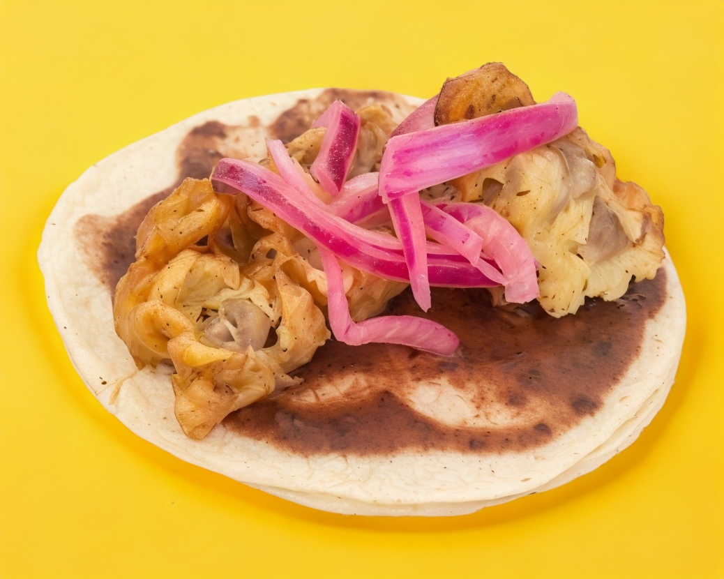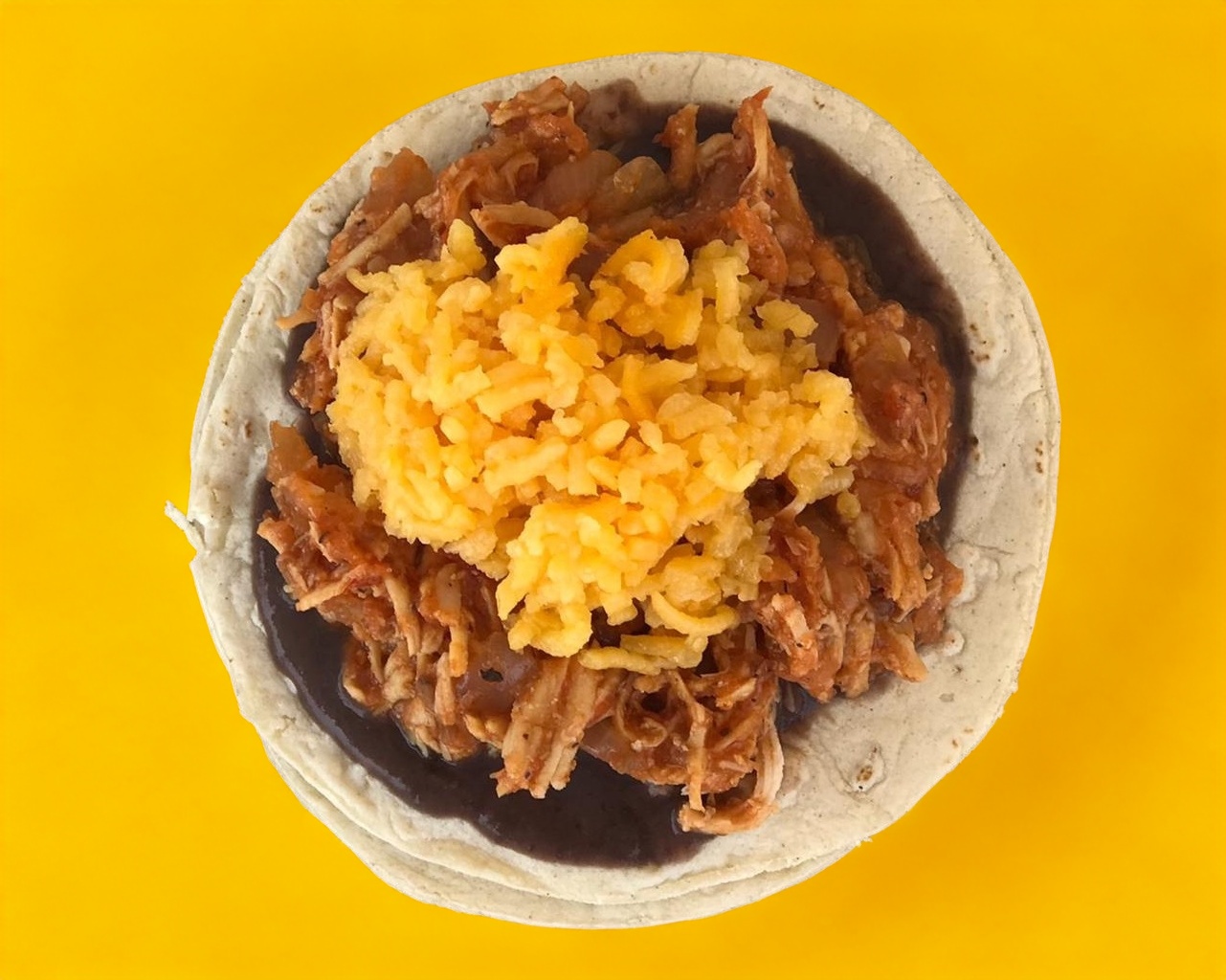 Taco de doble tortilla servido con arroz, frijoles y cebolla curtida.