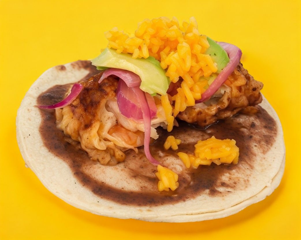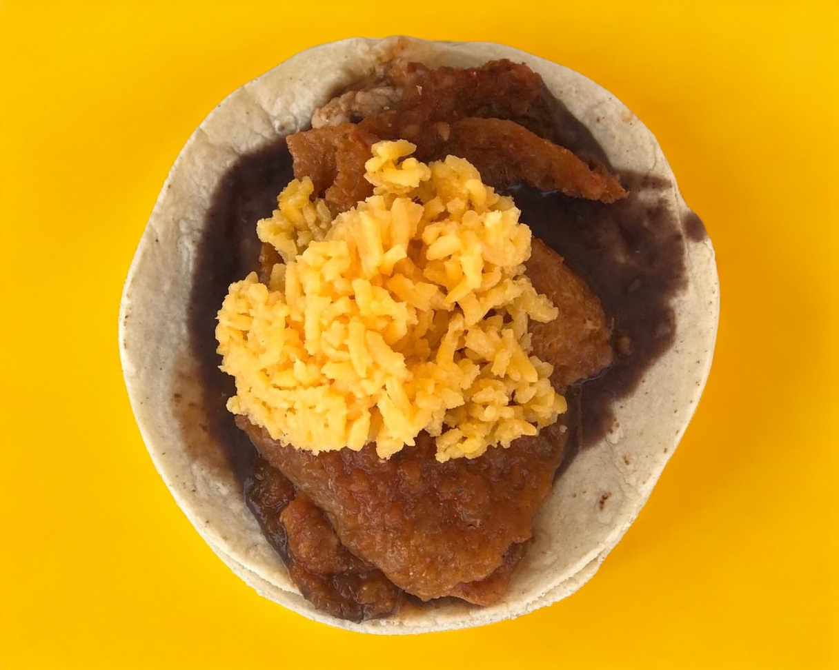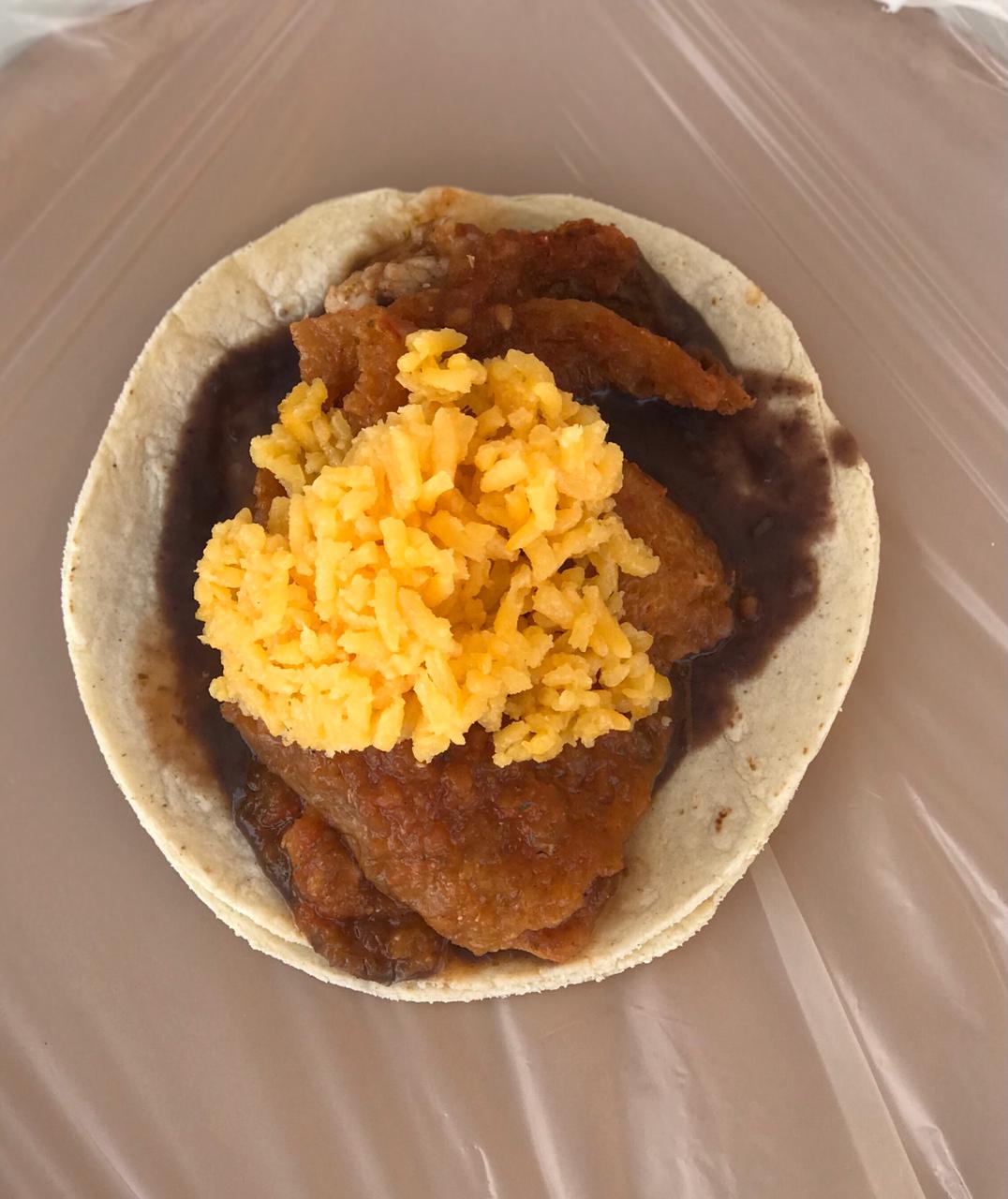 Taco de doble tortilla servido con arroz, frijoles y cebolla capeada.