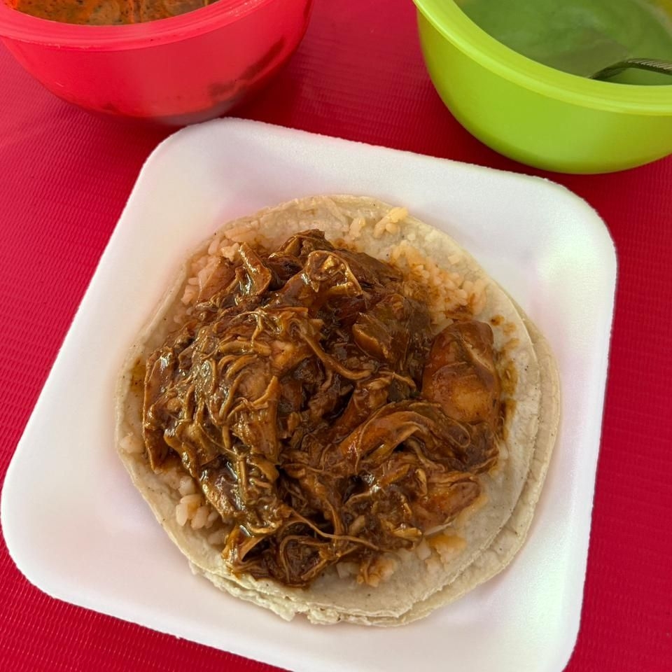 Taco base de arroz con pollo guisado en barbacoa.