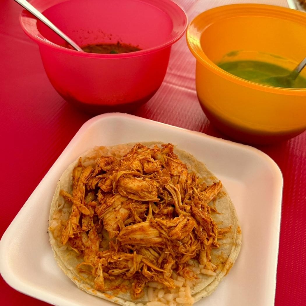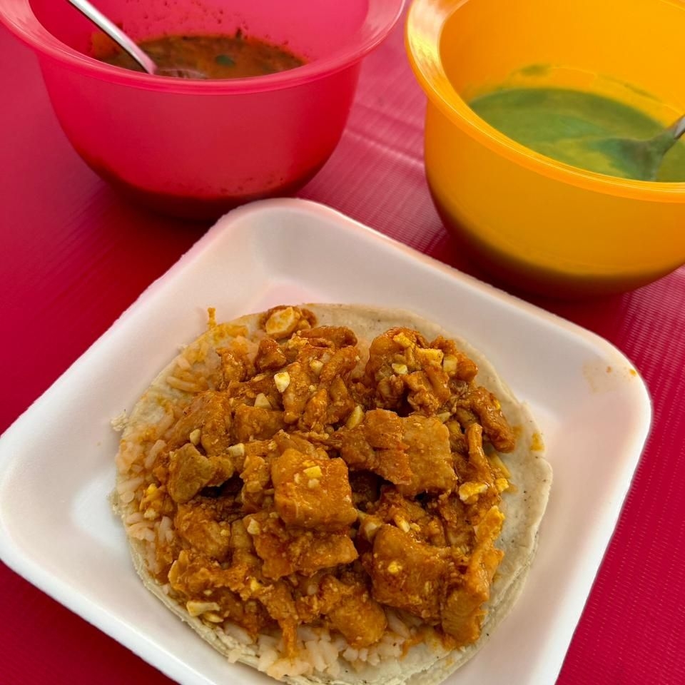 Taco base de arroz con pollo o carne con mole.