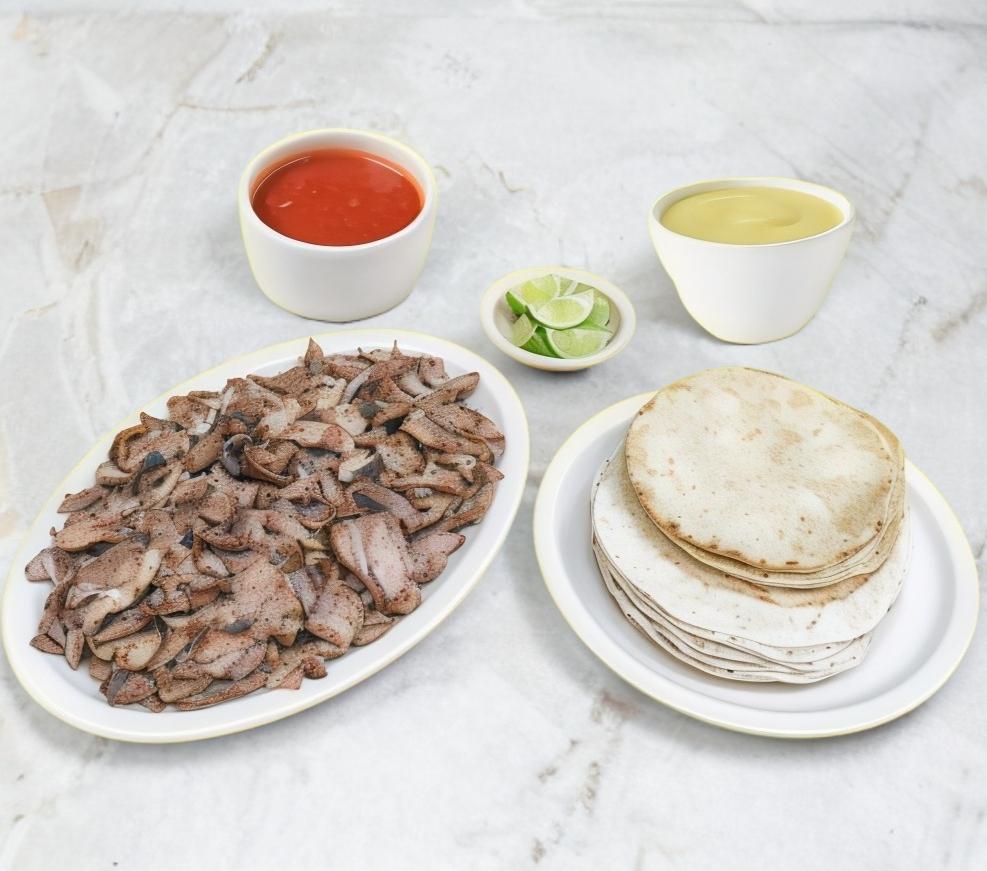 Incluye: 12 panes árabes, Salsa de Chipotle, Adereso de Habanero, Crema de Ajo y limones