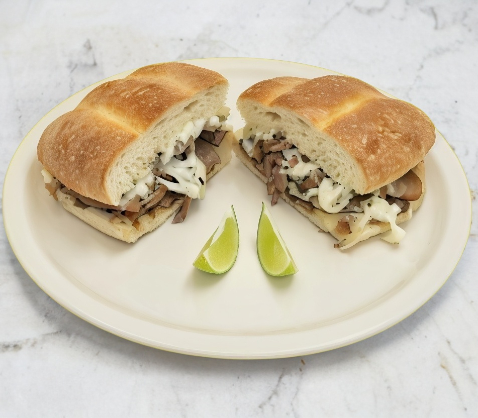 Torta de carne árabe con queso mozzarella, acompañada de salsas (crema de ajo, chipotle y habanero) y limones. Porción individual.