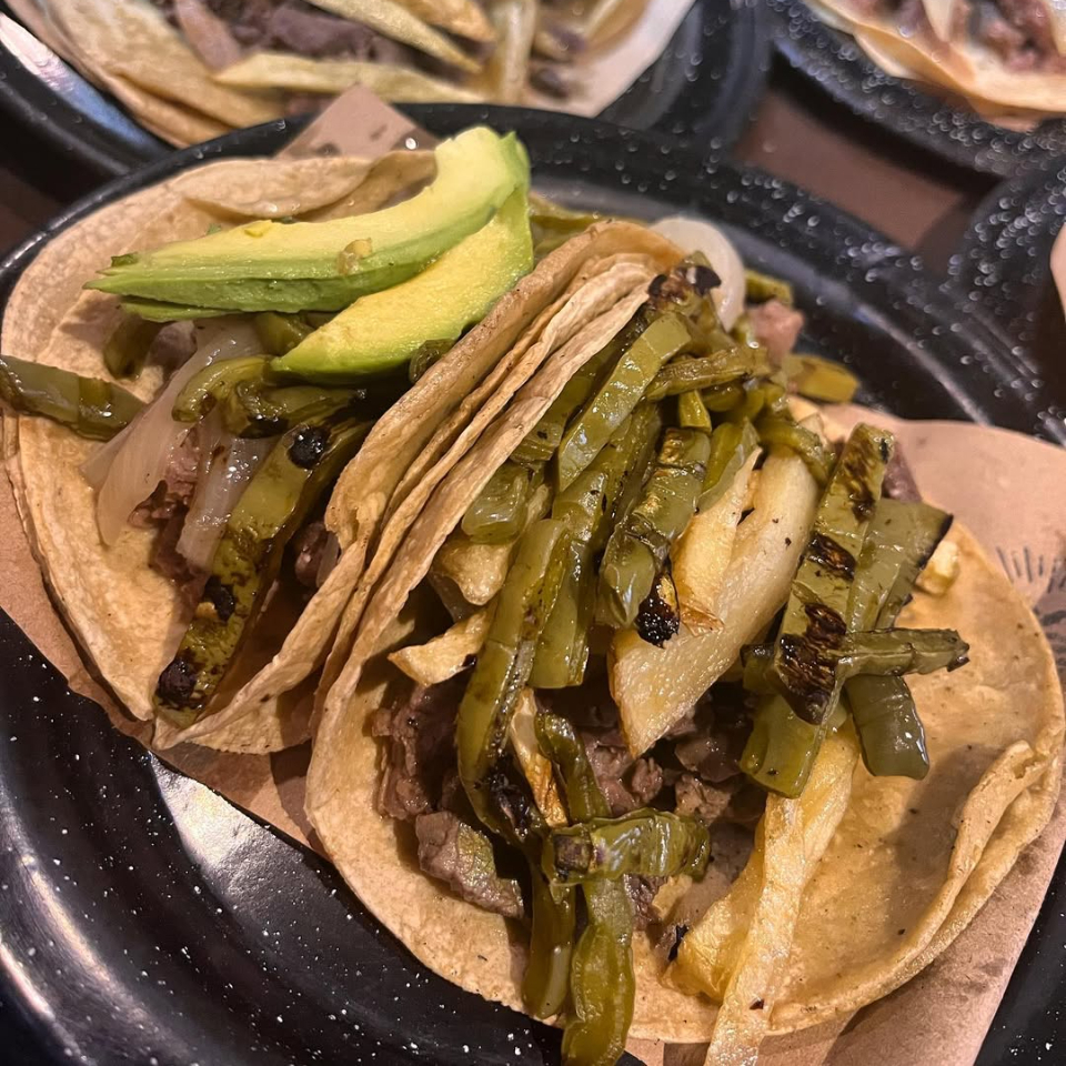 TACO DE ARRACHERA, ACOMPAÑADO DE NOPALES, CEBOLLA CARAMELIZADA Y PAPAS FRITAS (UNA EXPLOSIÓN DE SABORES DIRECTAMENTE EN TU PALADAR)