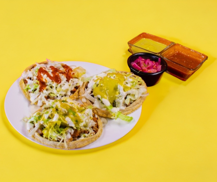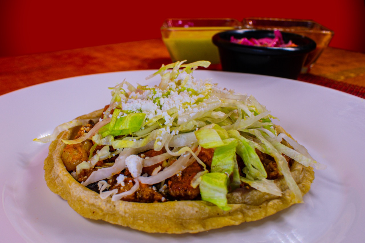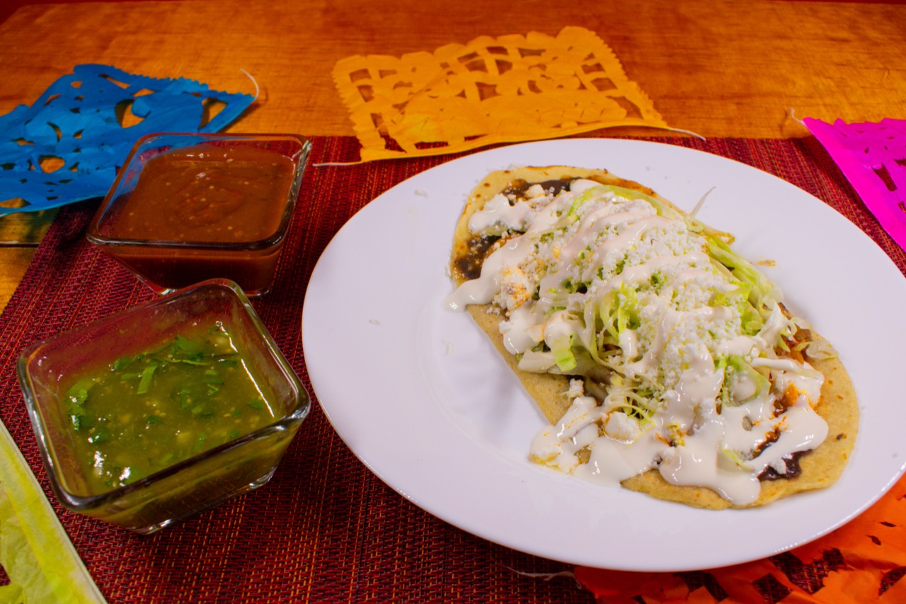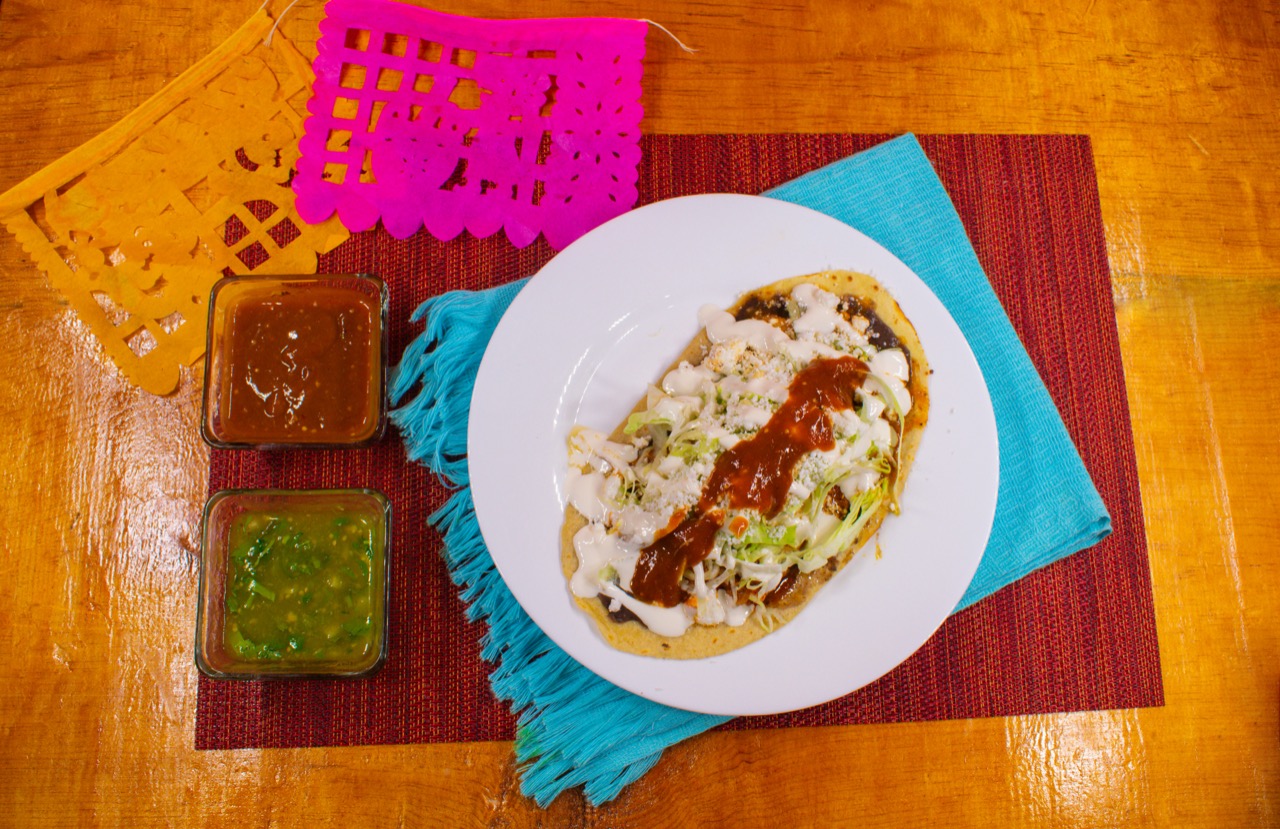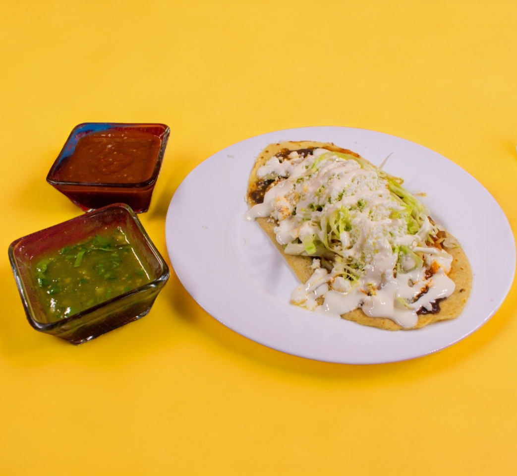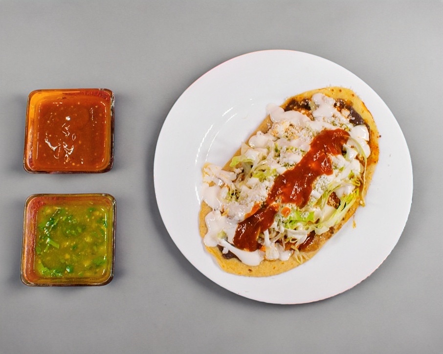 1 Pieza con masa de maíz, con carne al pastor, frijoles, lechuga, queso y crema.