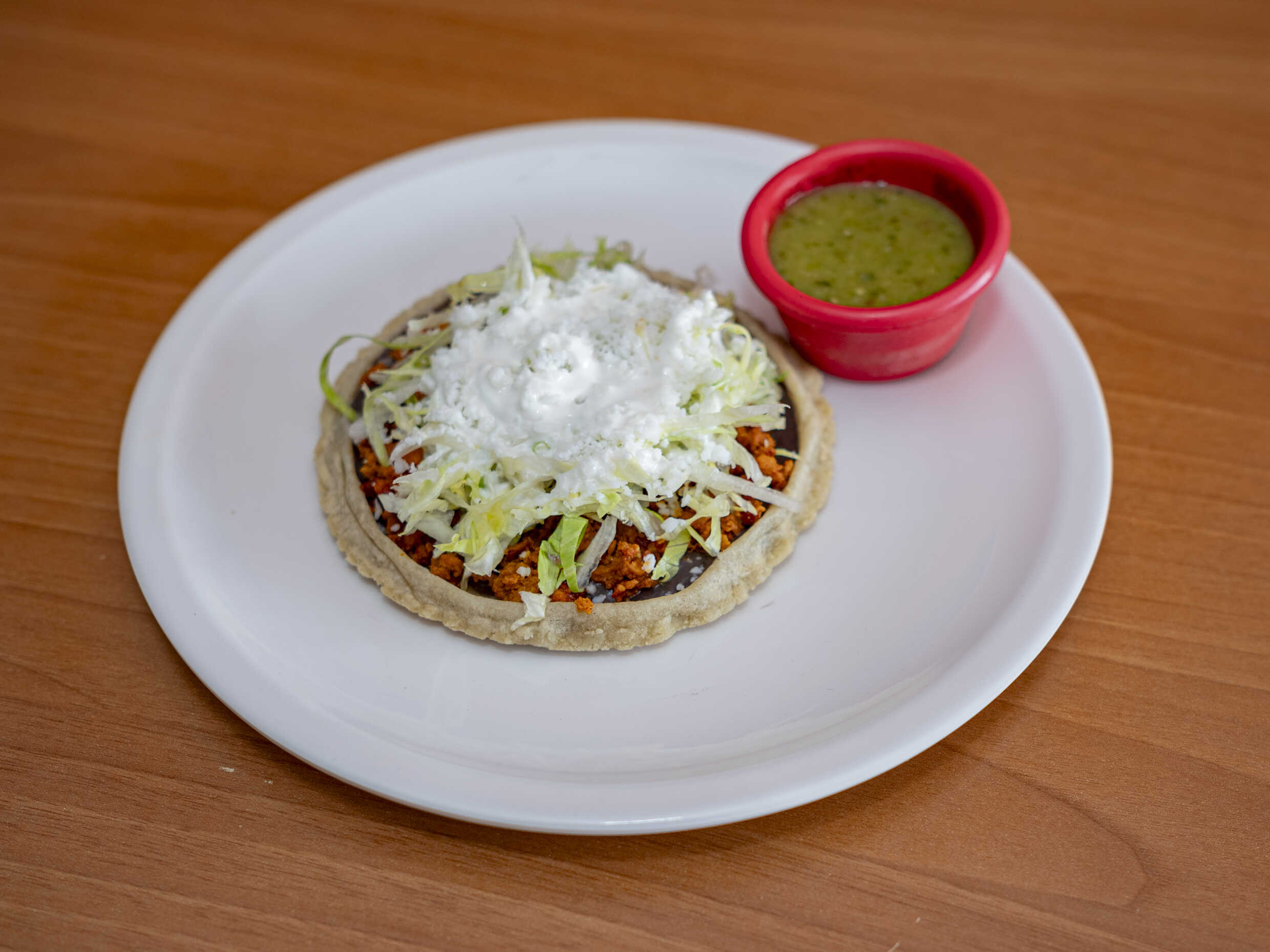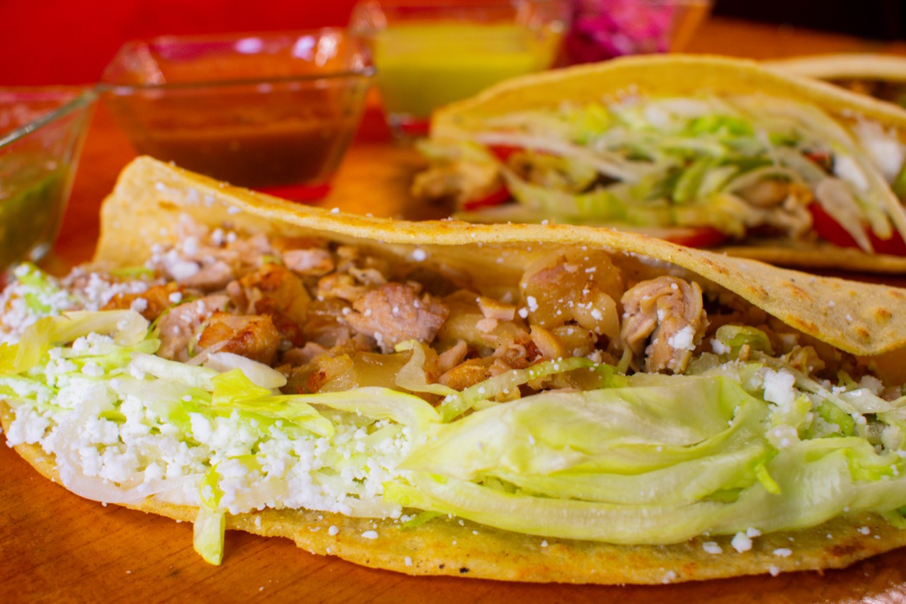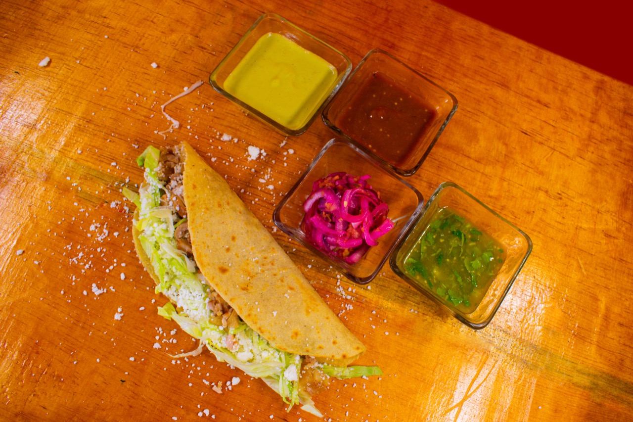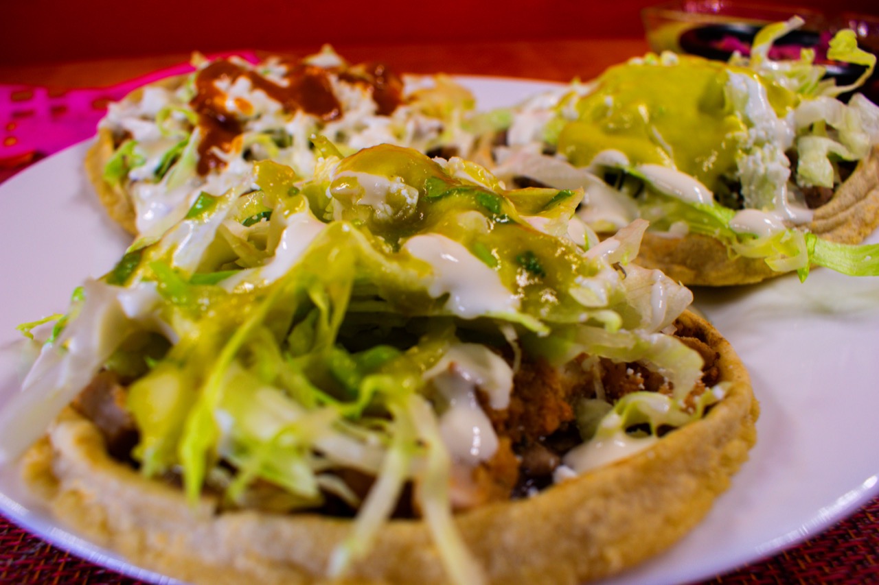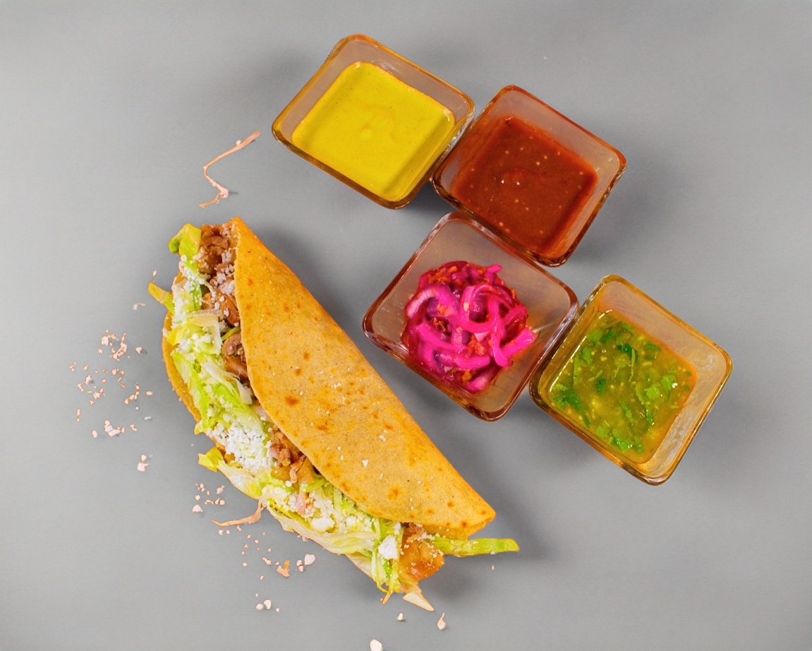 1 Pieza con masa de maíz, con carne al pastor, frijoles, lechuga, queso y crema.
