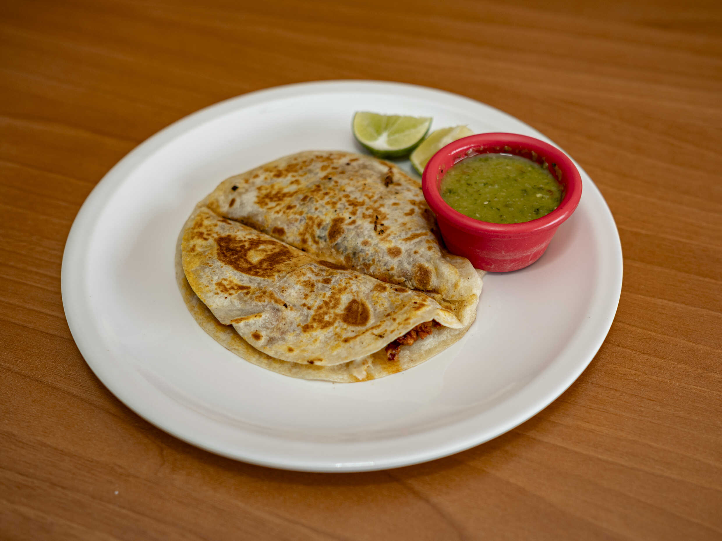Doble tortilla de harina con queso Oaxaca derretido, verdura y salsa.