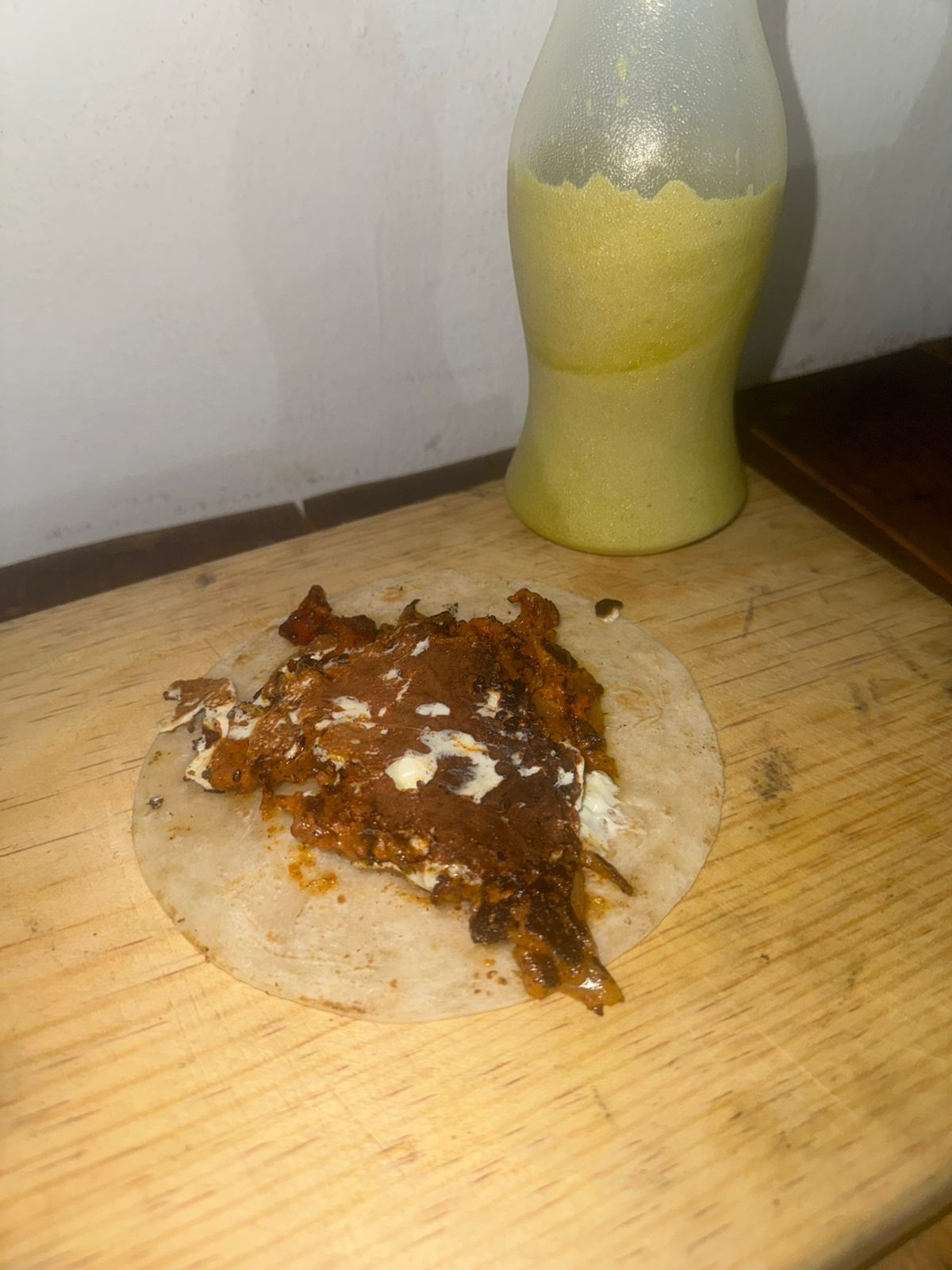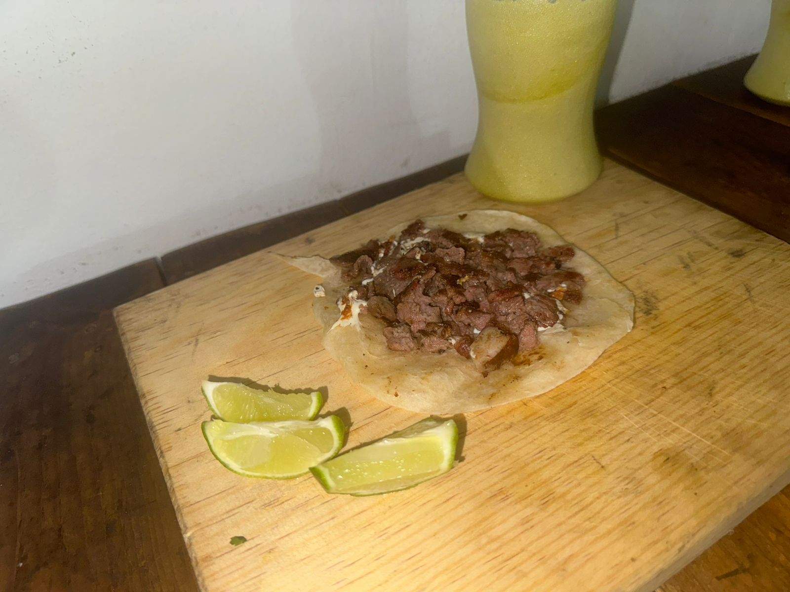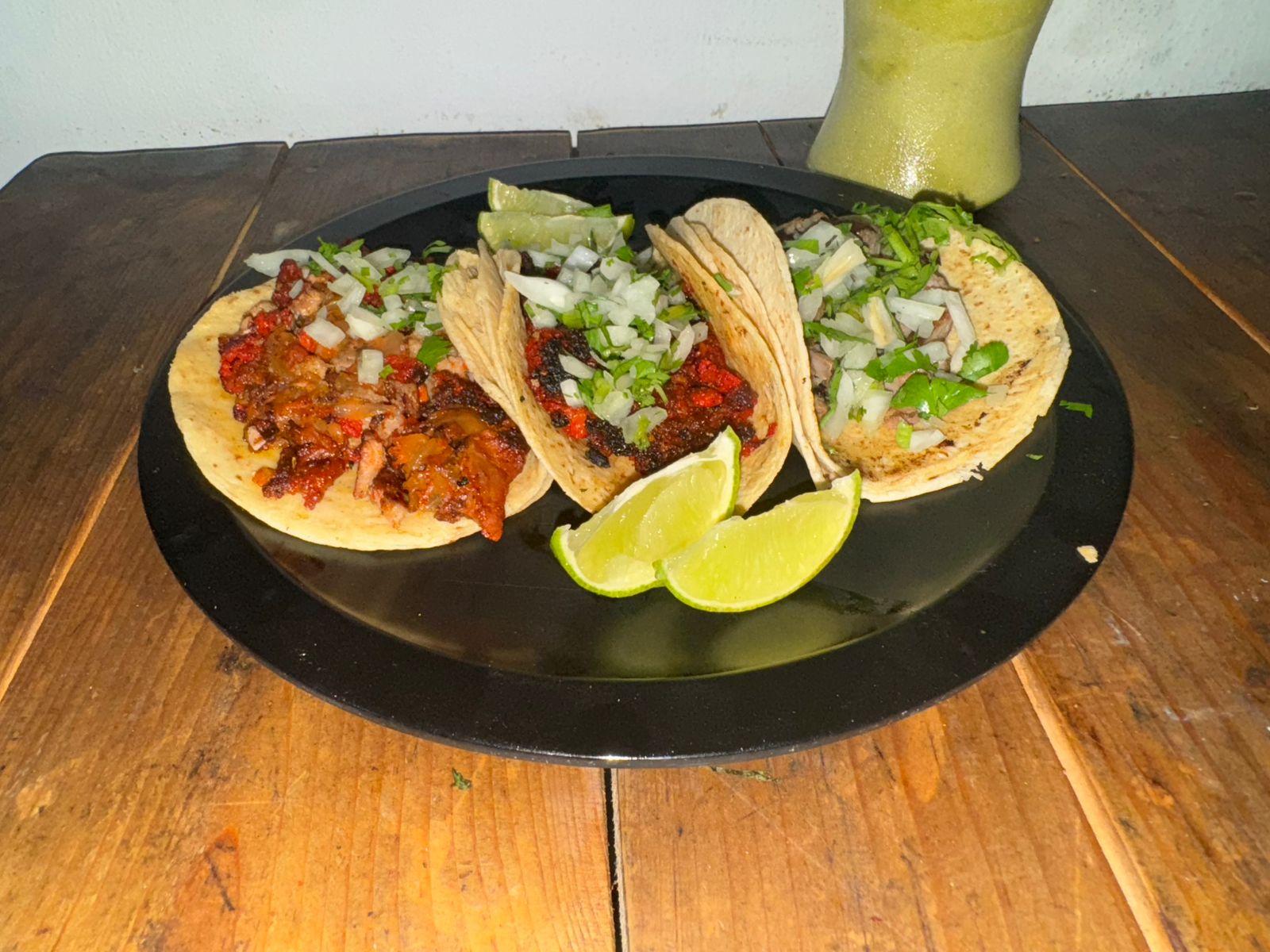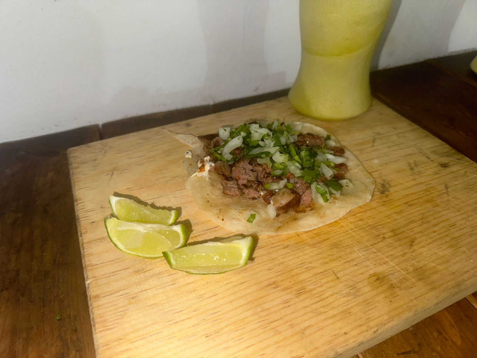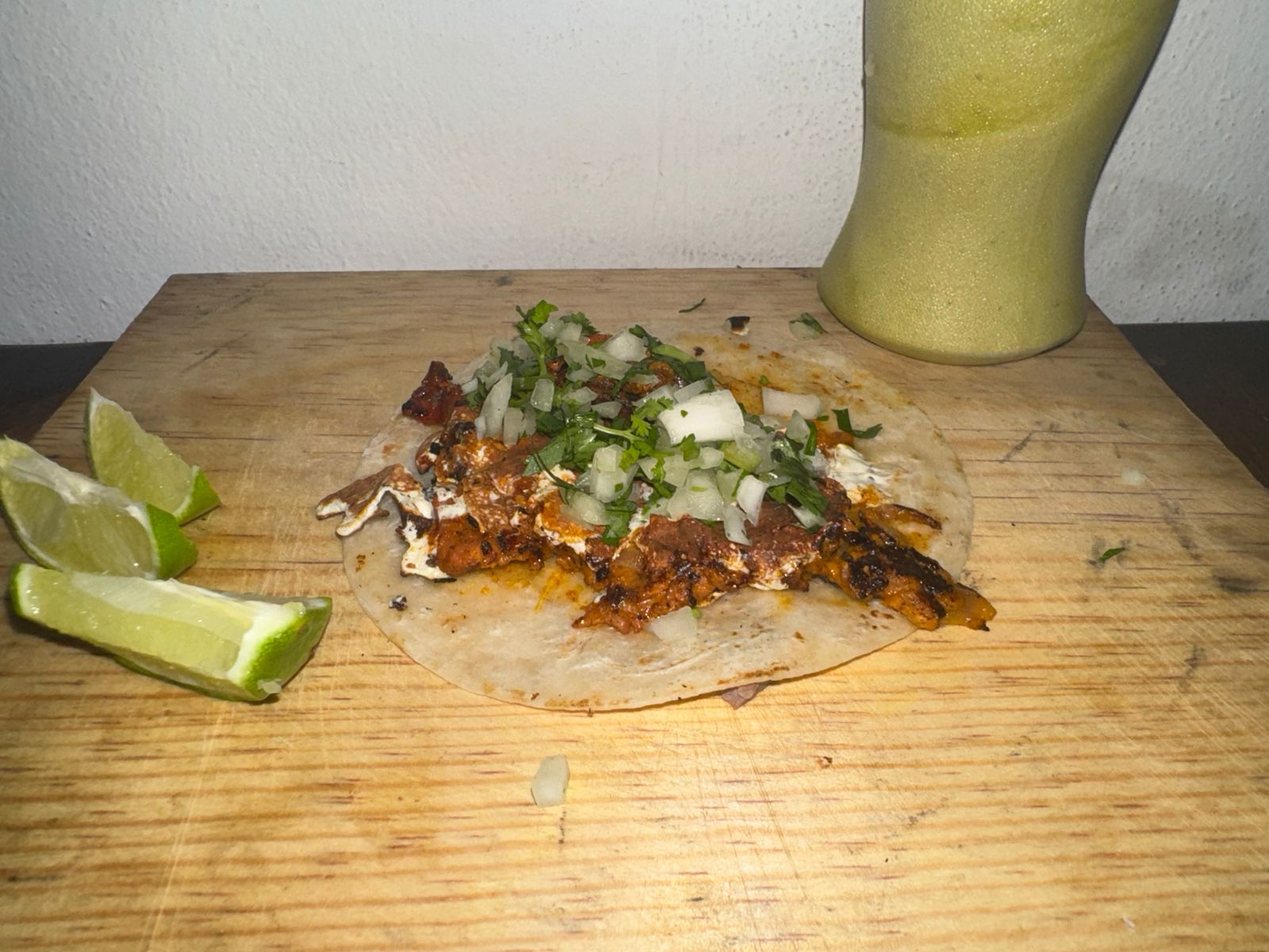 Tortilla de harina, cebolla, pimientos, pastor, cebollita y cilantro, ¡una explosión de sabor!.