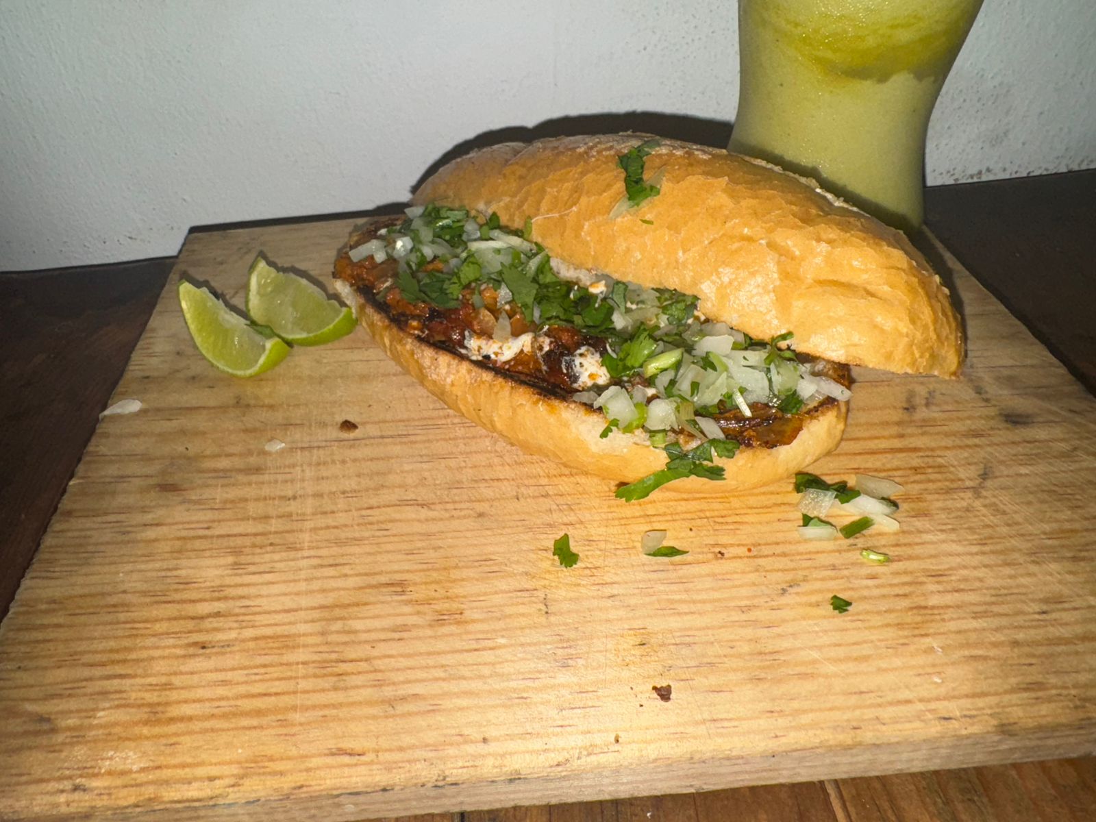 Jugosa carne de res, servida en un bolillo, acompañada de cilantro, cebolla y mayonesa. ¡Un clásico que te encantará!.