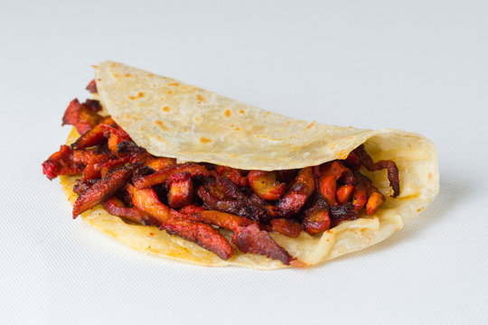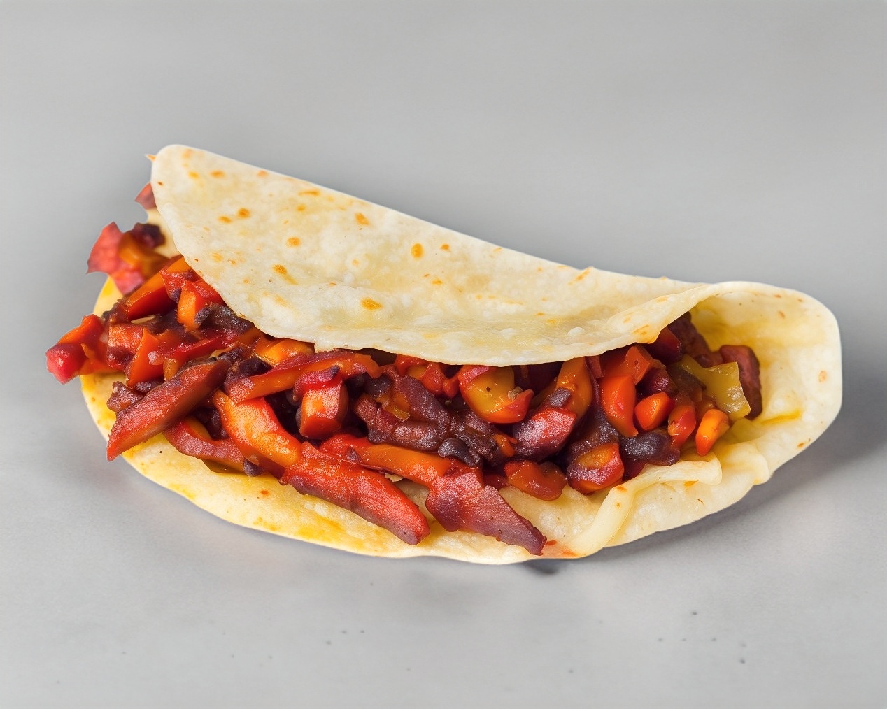 Tortilla de harina, cebolla, pimientos, pastor y cilantro una explosión de sabor,