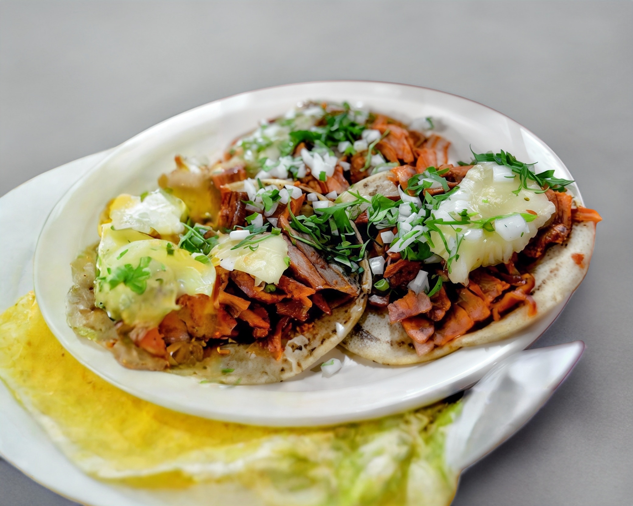 Carne de pastor jugosa y bien sazonada, servida en tortilla de maíz caliente con un toque de cilantro y cebolla, ¡un clásico irresistible!