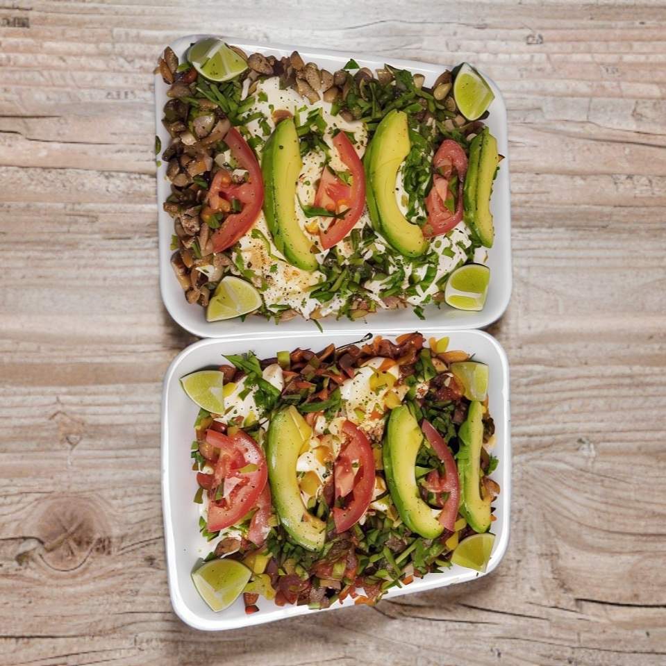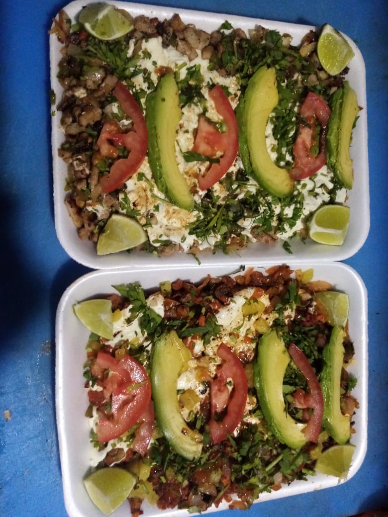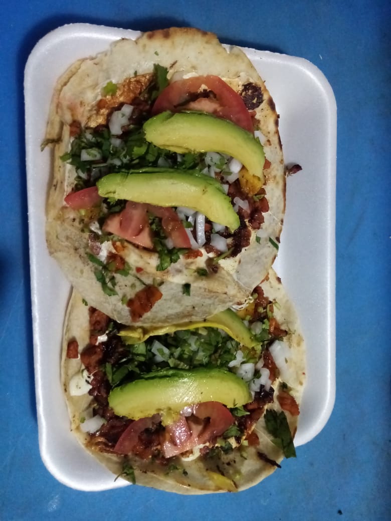 Chile morrón, cebolla, tocino, queso, tomate, aguacate, tortillas y carne a elegir.
