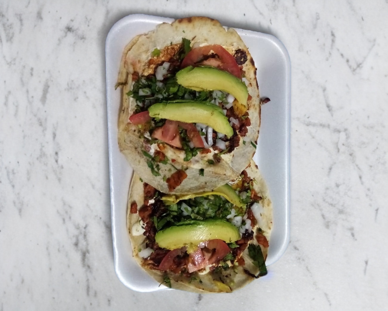 Chile morrón, cebolla, tocino, queso, tomate, aguacate, tortillas y la carne a elegir.