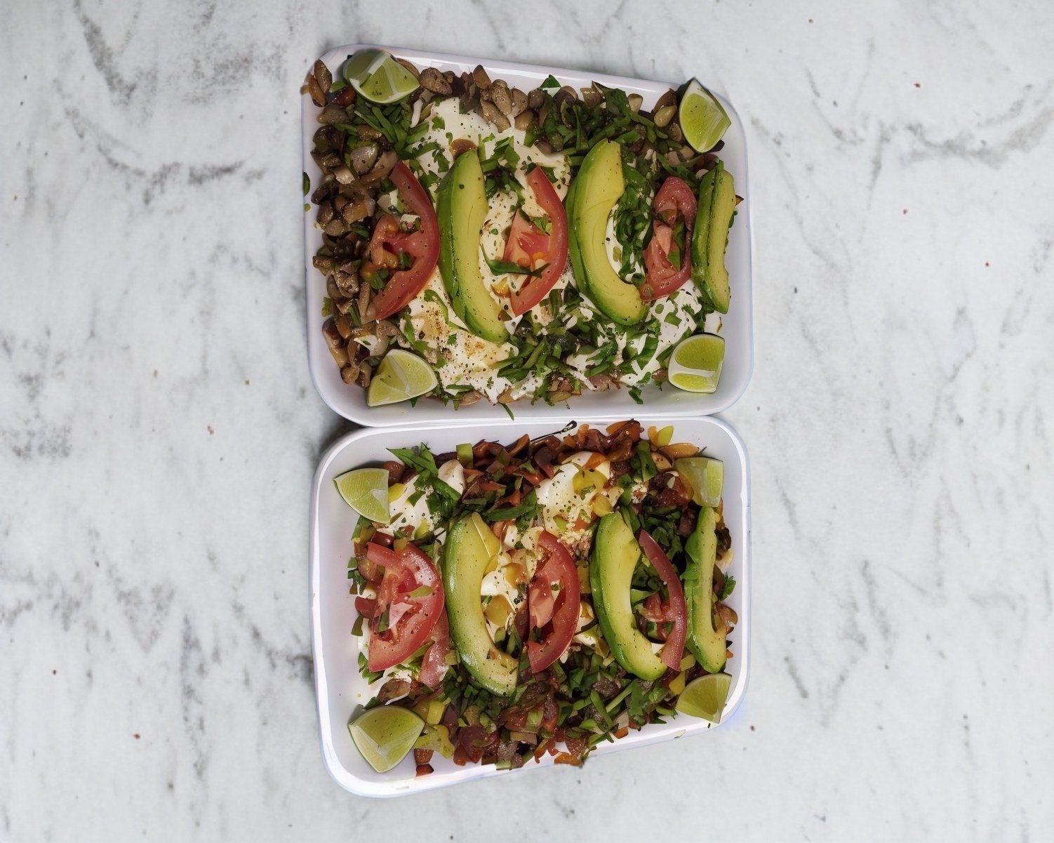 Acompañado de frijoles, queso Oaxaca, tomate, aguacate, lechuga y crema.