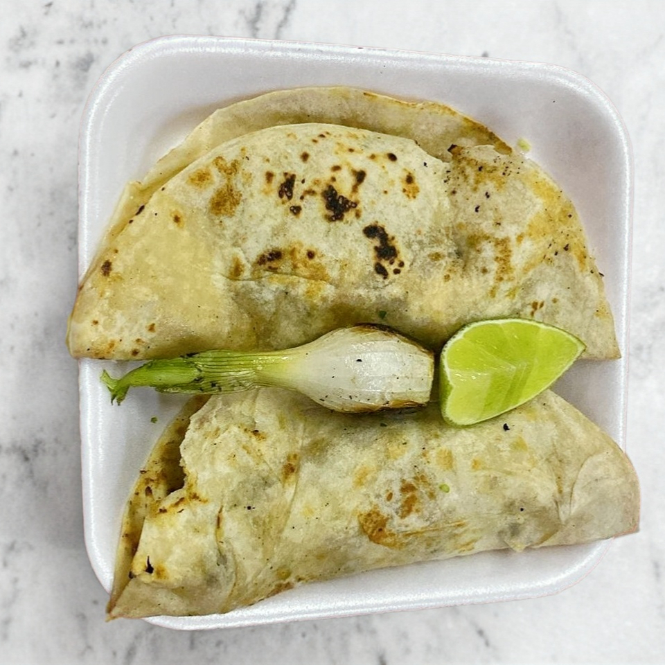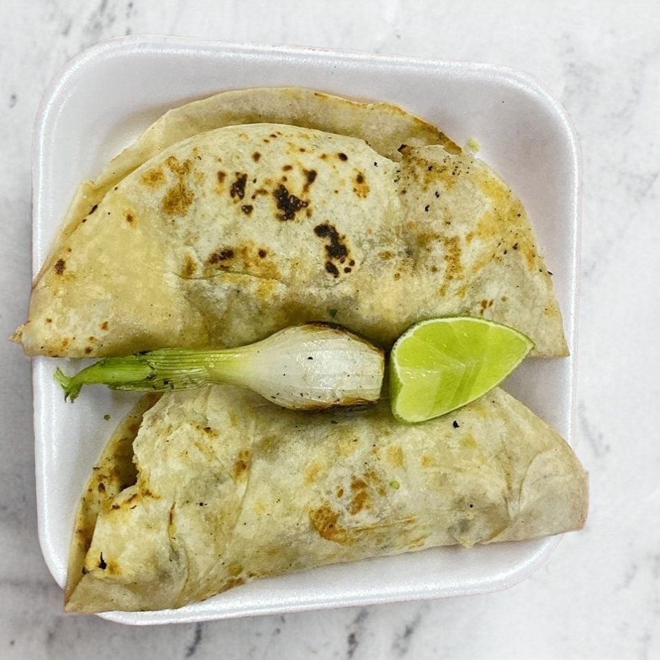 Tortilla de harina con queso, carne, cebolla, cilantro, doblada a la mitad, relleno a elegir. Por unidad