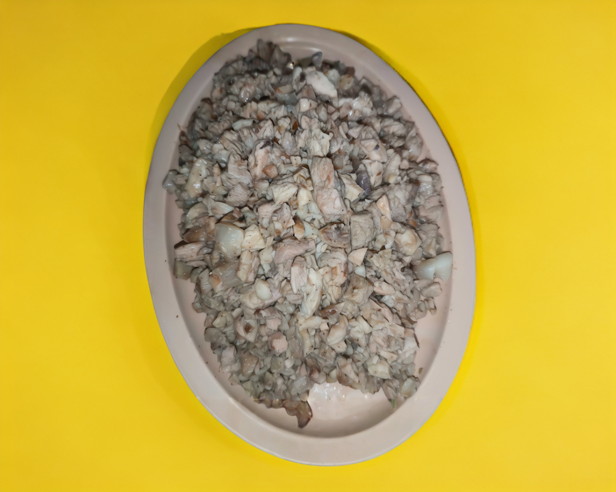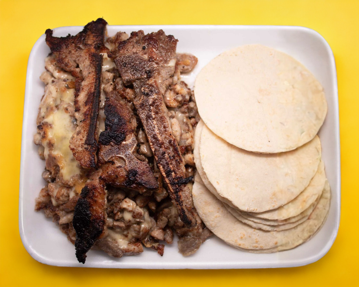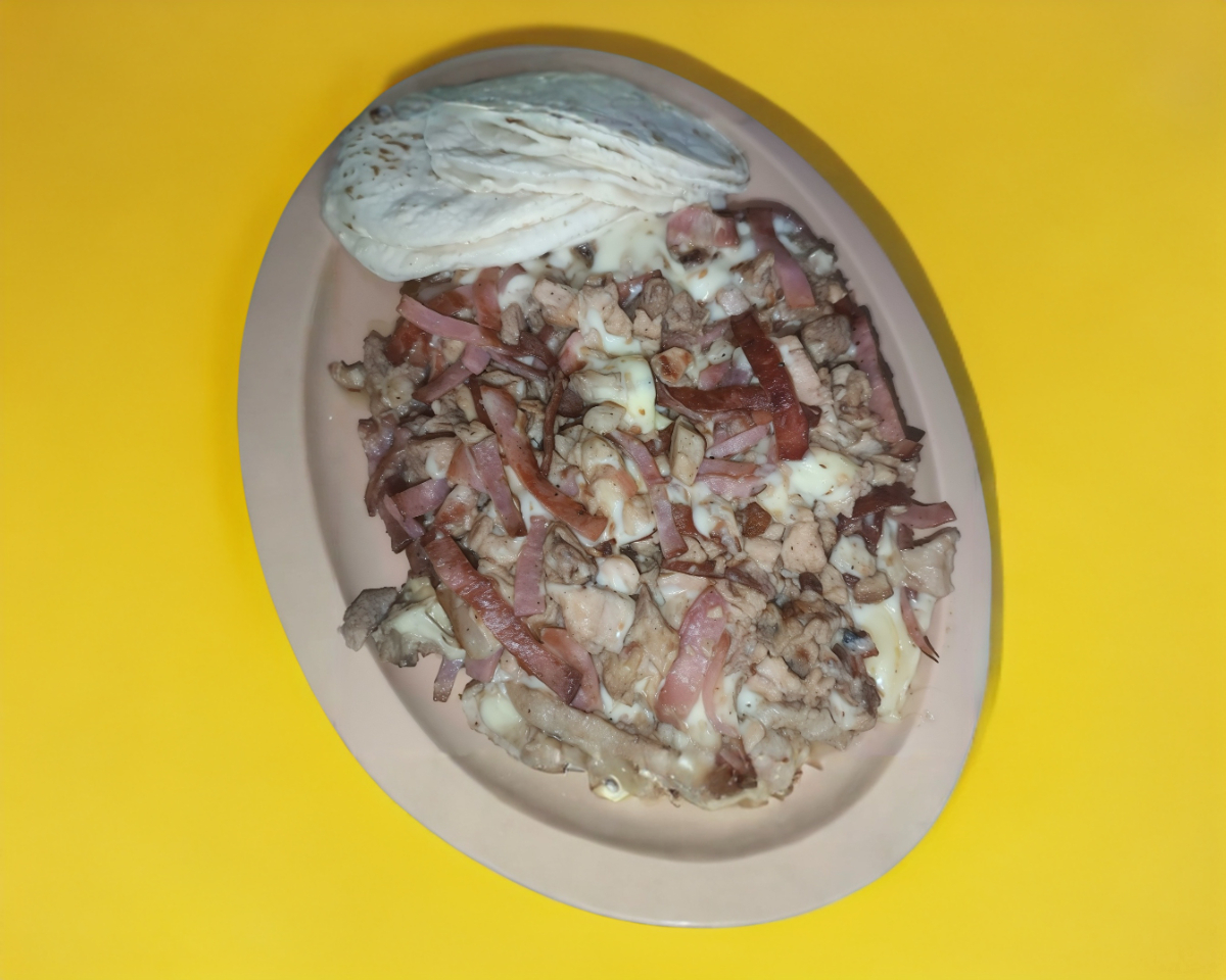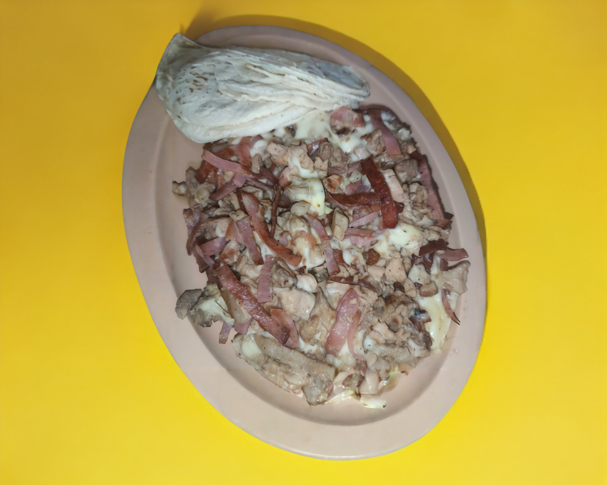 Carne de Chuleta, tocino, cebolla, pimiento morrón, tortillas y queso.(200g)