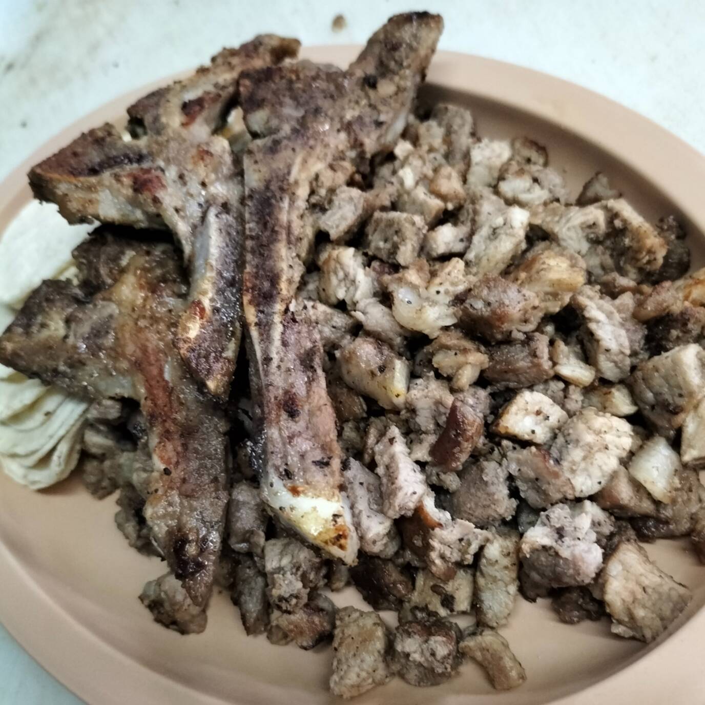 chuleta al mojo de ajo,pimiento,cebolla,tocino,tortillas.(250g)
