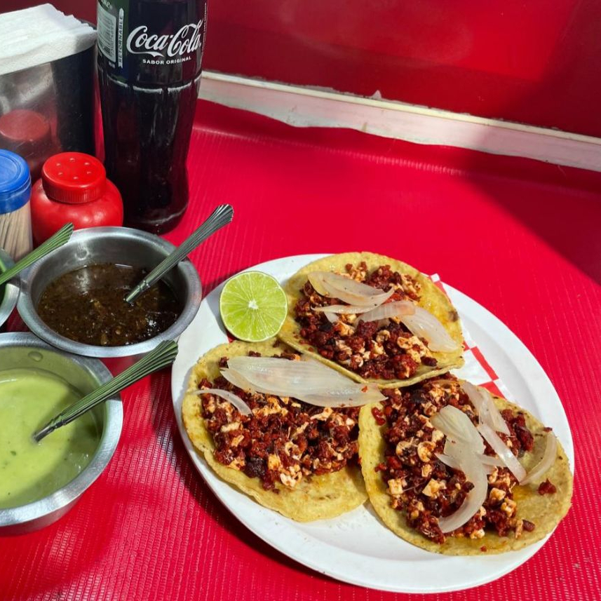 taco con totillas hecha amano, frijol refrito ,chorizo y cebolla asada