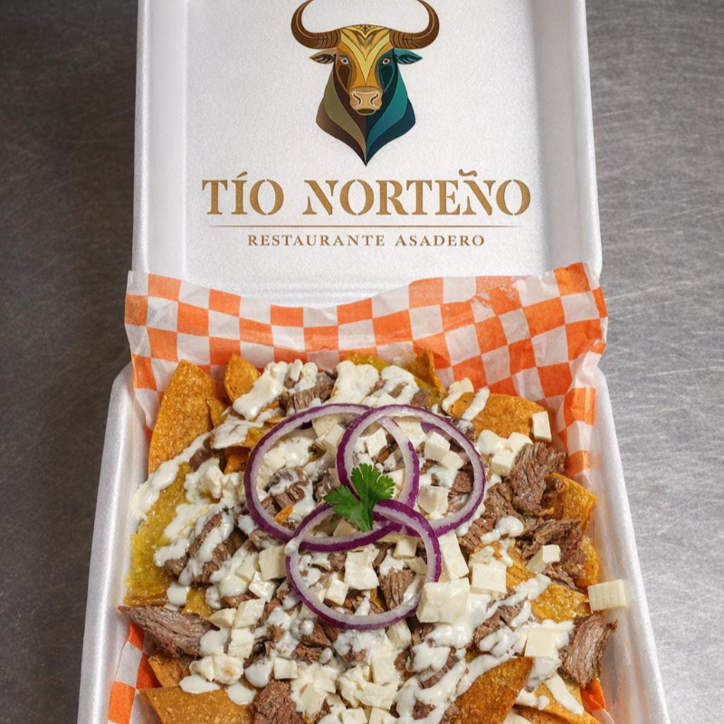 Totopos bañados de salsa con carne de arrachera acompañado de frijoles y salsas