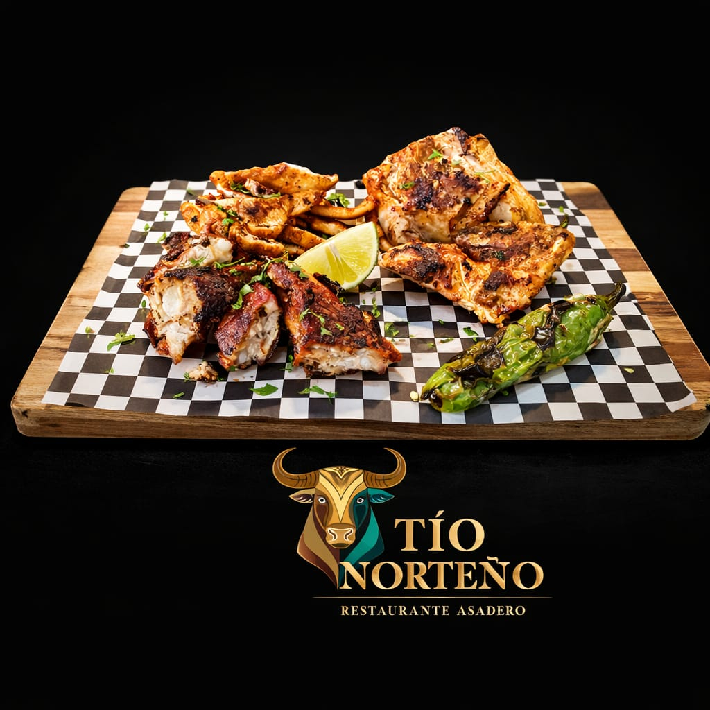 1 Pollo, 400gr costilla asada, salchichas, 4 guarniciones y arroz, frijoles, salsa verde y tortillas