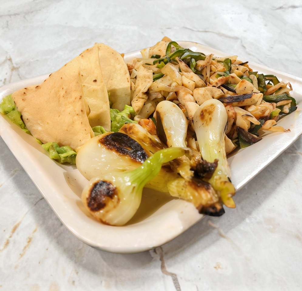 Con tortillas, salsa, limón, guacamole, cebollitas cambray y frijoles charros.