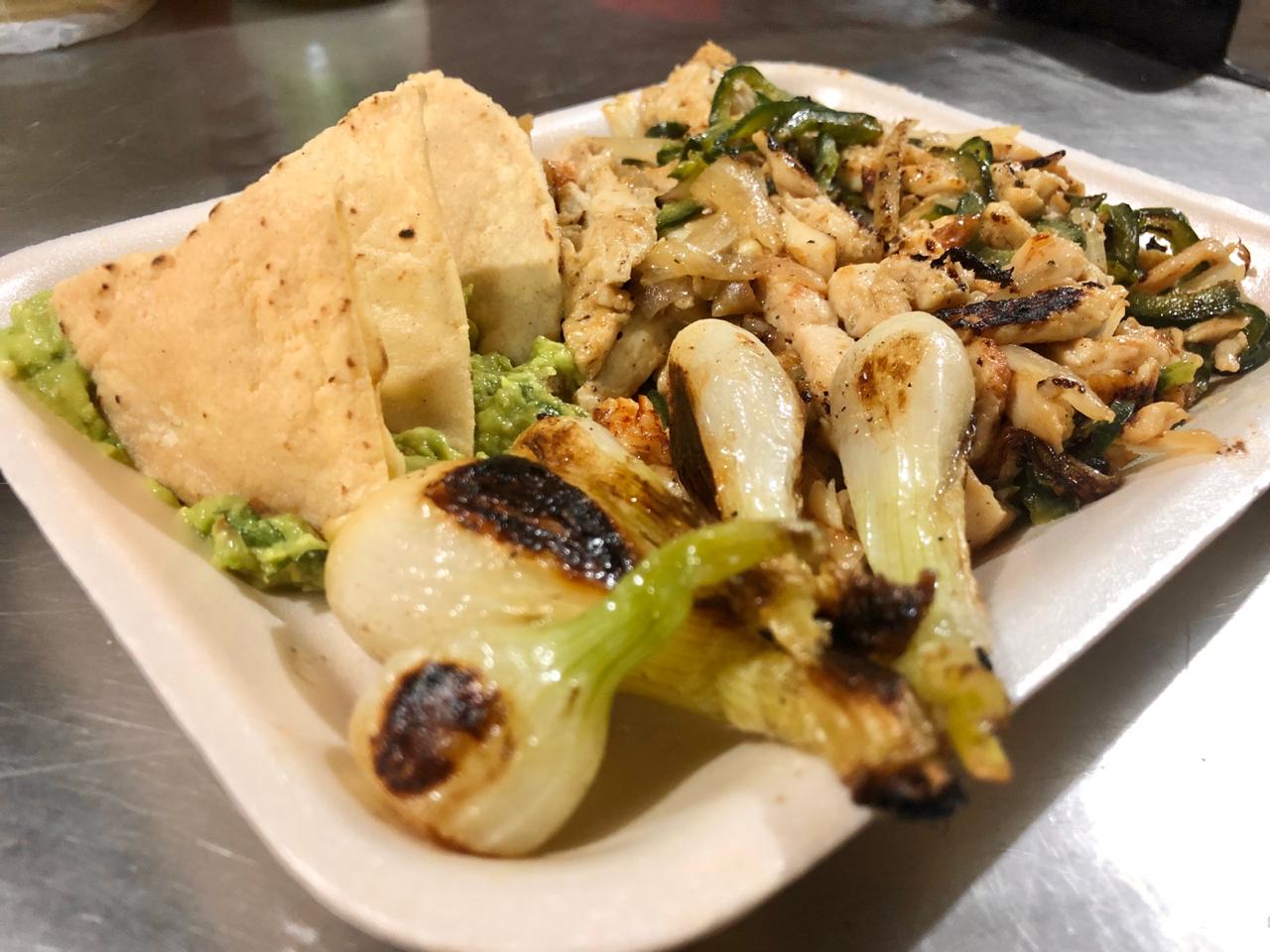 Con tortillas, salsa, limón, guacamole, cebollitas cambray y frijoles charros.